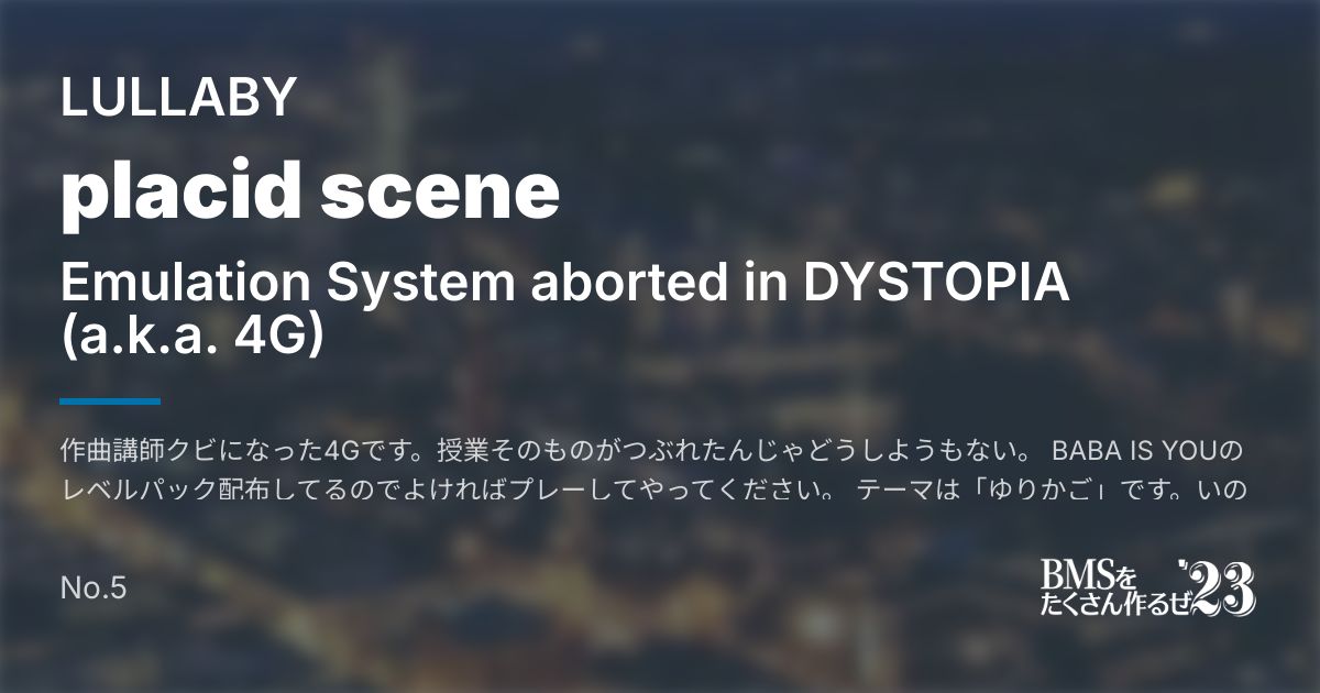 作曲講師クビになった4Gです。授業そのものがつぶれたんじゃどうしようもない。 BABA IS YOUのレベルパック配布してるのでよければプレーしてやってください。 テーマは「ゆりかご」です。いのちのはじまり、いのちのおわり。 その生涯にせめてもの安らぎをという感覚で作りました。実際どうなんですかね。 SPI譜面以外はPL法守ってます。SPN、SPH、DPNはフルコン済。 SPAとDPHはBP2、DPAはノマゲまで。 Q.なにそのBPM。102じゃないの? A.諸事情で音を後付けで足したのでこうなった。 Q.DPHとDPAに無理皿あるんですけど。 A.いつものことです。 Q.SPA発狂しすぎでは。 A.ラストに回復あるので。 Q.ギターの音そうはならんやろ。 A.ピックのタイミングに合わせたのでああなった。 Q.SPIなにこれ? A.がんぼるちゃれんじ。 ------------- 追記:read meのDPNの難易度誤表記していますが気にしないでください。 ------------- 追記2:ハッシュ割れるから修正できないけどNOMALってなんだノマルたまんねぇ。
