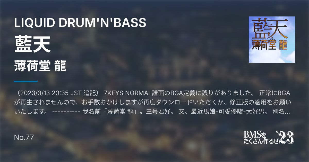 (2023/3/13 20:35 JST 追記) 7KEYS NORMAL譜面のBGA定義に誤りがありました。 正常にBGAが再生されませんので、お手数おかけしますが再度ダウンロードいただくか、修正版の適用をお願いいたします。 ---------- 我名前「薄荷堂 龍」。三号君好。 又、最近馬娘-可愛優駿-大好男。 別名、天竺鼠君(命名:亜倶寧須多紀音) 作曲…? (彼、動物実験影響、忘却作曲方法、発光総天然色。) …偽中国語使用、意味有? (今締切二時間前、超焦。) 否、偽中国語不使用、我存在意義消失…。 我偽中国語使用開始、「薄雲」作曲時。四年半前。 (四年半前!?怖~…。) 使用理由、存知無遊戯者増加。 是非、辞意痛亜流二〇一八之団体、「渡来人」楽曲早速遊戯! (理由理解不能?五月蝿!!!!!珍珍電車発車!!!!!!!!!) 藍天、青空意味。 言葉響、芋天似。 普通譜面、灰譜面、多分丁度良。穴譜面、星一二注意! 謝謝茄子!
