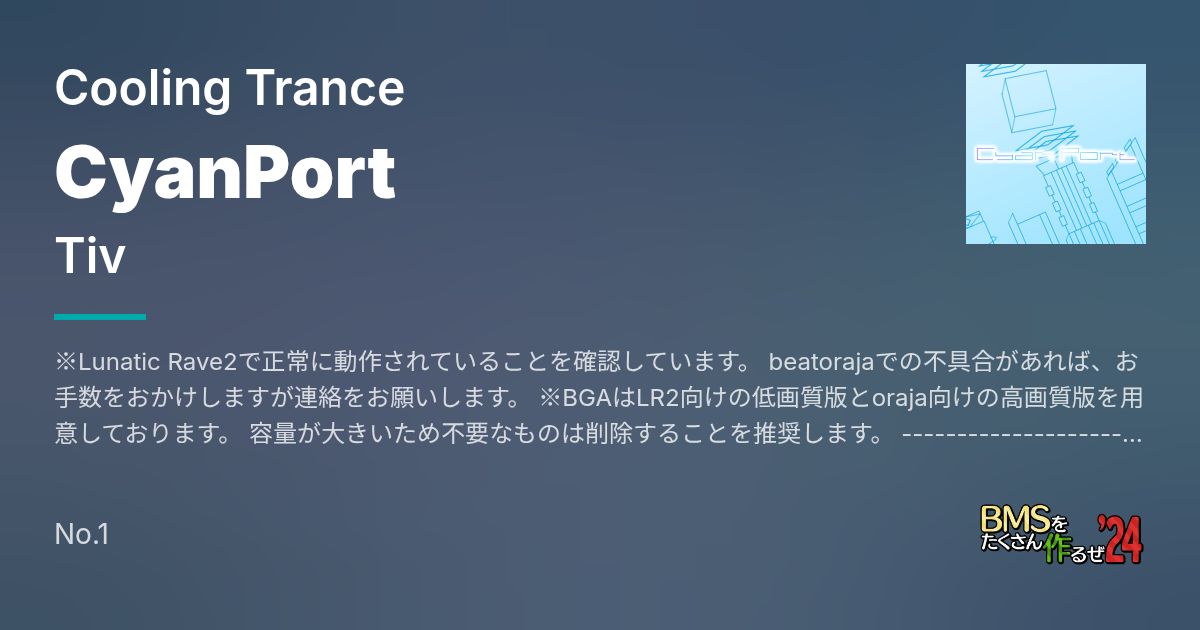 ※Lunatic Rave2で正常に動作されていることを確認しています。 beatorajaでの不具合があれば、お手数をおかけしますが連絡をお願いします。 ※BGAはLR2向けの低画質版とoraja向けの高画質版を用意しております。 容量が大きいため不要なものは削除することを推奨します。 --------------------------------------------------- -青く染まったこの港で、海辺の風を感じていたい。- Title:CyanPort Genre:Cooling Trance BPM:158 Artist:Tiv【X(Twitter):@tivmusic_chp】 BGA:Tiv --------------------------------------------------- どうもです。クリスマスシーズンの数日間肉と炭酸キメすぎて危機感を覚えているTiv(てぃぶ)です。 今回は正統派なトランスを作ってみました。 BOFに出したやつは冷静に考えたらどこからどう見てもトランスじゃなかったので、 それの反省も兼ねてちゃんとしたトランスを作ることになったというわけです。 これでもトランスじゃねぇよ!!って指摘を受けたら木の下に埋めてもらっても構わないです。(フラグ) もちろんトランスを作りたかっただけじゃなく、今作にはガッチリとテーマを定めています。 それはズバリ「大阪市住之江区の咲洲」です。コミケとかよくやってる場所です。 でっかいタワーとか、船がよく見える海とか、自動運転の電車とか、なんとなく近未来感あるじゃないですかね? 俺自身1990年代の考える近未来の風景が結構好きで、年に2回は訪れているほどです。 こういうのってトランスとか似合いそうだなぁと思ってこの曲を作ることになりました。 この作品をプレイすることで、涼しく青い風を感じていただけると幸いです。 X(Twitter)(気ままに更新中) https://twitter.com/tivmusic_chp SoundCloud(色々上げたり上げなかったり) https://soundcloud.com/tivremisuke note(たまーにブログ的な何かを。過去のBMSも保管中) https://note.com/tiv_03sk YouTube(BGAや音源などを気まぐれで投稿) https://www.youtube.com/channel/UC3pMoThTt8gpoAHPsNfIi8Q 連絡用メアド(TwitterのDMが出来ない場合の問い合わせやリンク切れ報告に) tivdirectmass@gmail.com おまけ CyanPortの選曲BGM https://drive.google.com/file/d/1g_j3HcnjvYoJbNvnEes2DzSkJTQmWUXL/view?usp=drive_link