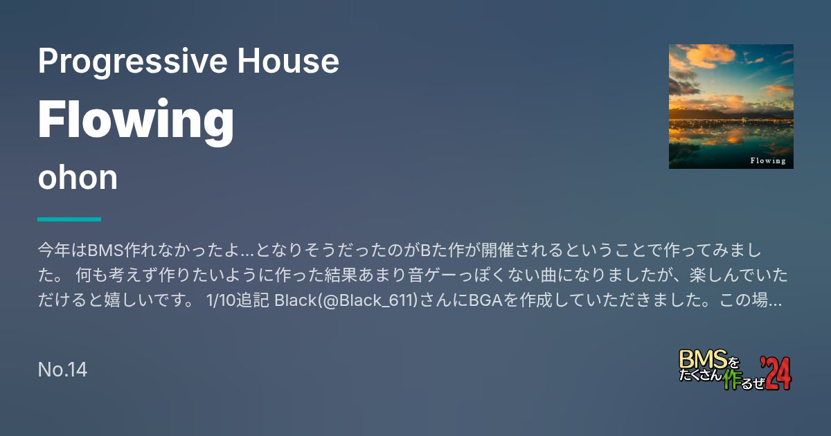 今年はBMS作れなかったよ…となりそうだったのがBた作が開催されるということで作ってみました。 何も考えず作りたいように作った結果あまり音ゲーっぽくない曲になりましたが、楽しんでいただけると嬉しいです。 1/10追記 Black(@Black_611)さんにBGAを作成していただきました。この場を借りてお礼申し上げます。 アーカイブもBGAありのものに更新しましたので、是非映像付きでお楽しみください! 本体毎にアーカイブを用意していますが、特にこだわりがなければ通常版で問題ないと思います。