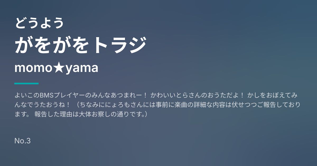 よいこのBMSプレイヤーのみんなあつまれー! かわいいとらさんのおうただよ! かしをおぼえてみんなでうたおうね! (ちなみににょろもさんには事前に楽曲の詳細な内容は伏せつつご報告しております。 報告した理由は大体お察しの通りです。)