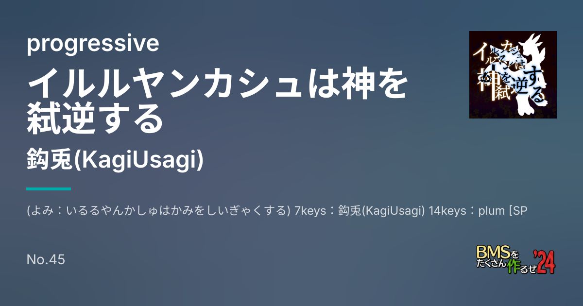 (よみ:いるるやんかしゅはかみをしいぎゃくする) 7keys:鈎兎(KagiUsagi) 14keys:plum [SP NORMAL] ☆007=700 (▽7相当) [SP HYPER] ☆010=943 (▽9~10相当) [SP ANOTHER] ☆012=1214 (▼0-相当) [DP NORMAL] ☆006=671 [DP HYPER] ☆011=1335 [DP ANOTHER] ☆012=1679 急にプログレが作りたくなったので作りました。どうせならボスっぽい曲でプレアンっぽい不安定な曲がいいなということで5拍子のプログレに。 SP ANOTHERのみ、あえてノーツを置いていない箇所があり、暴れても音が出ないようになってます。 冷静になりましょう。 曲名は神話を元にしてます。