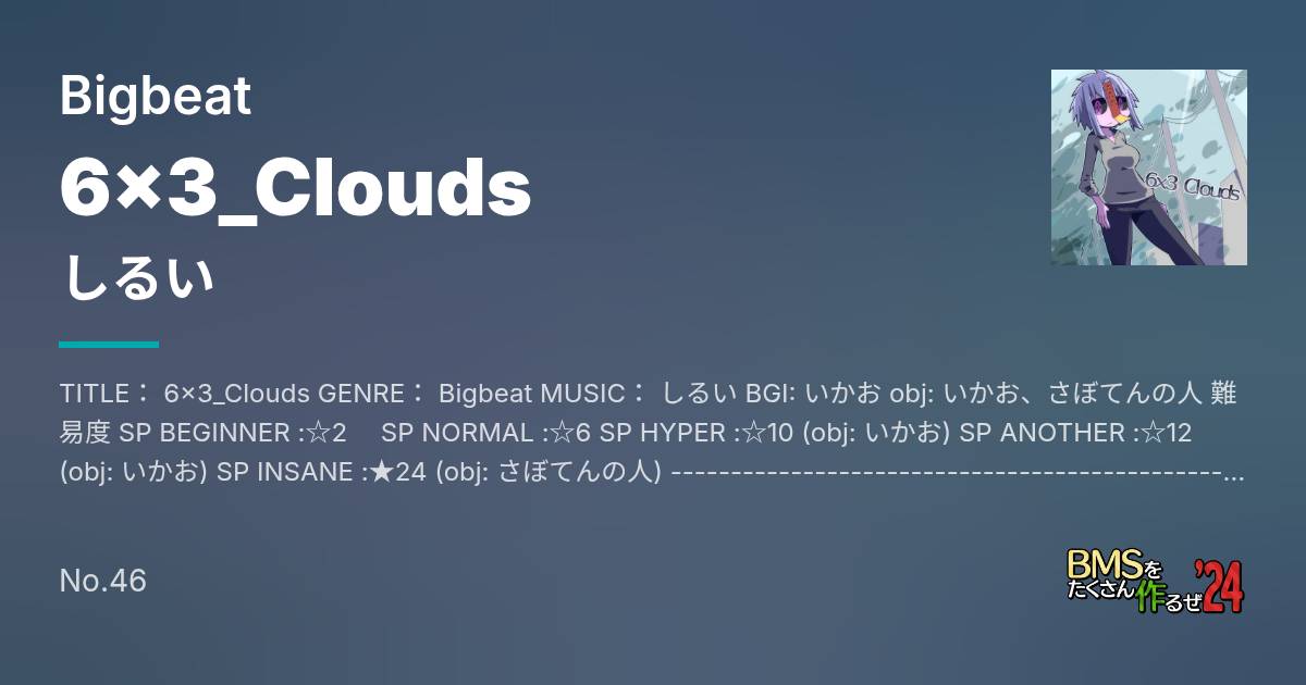 TITLE: 6x3_Clouds GENRE: Bigbeat MUSIC: しるい BGI: いかお obj: いかお、さぼてんの人 難易度 SP BEGINNER :☆2 SP NORMAL :☆6 SP HYPER :☆10 (obj: いかお) SP ANOTHER :☆12 (obj: いかお) SP INSANE :★24 (obj: さぼてんの人) ----------------------------------------------- [Music:しるい] こんにちは、しるいです。 今回はいかおさんのキャラクター「ミ六ねーちゃん」をテーマにした曲になります。 ダーク+カッコイイ な雰囲気を目指して作りました。 Bigbeatは初めて作るジャンルでしたが難しい…!色々と勉強になりました。 皿多めの譜面になっておりますので是非遊んでみてね( ・ω・)b 最後になりますが、今回リクエストして下さったいかおさん、譜面で協力頂いたさぼてんの人さんにこの場を借りてお礼申し上げます。 ありがとうございました! X(旧Twitter) @mososirui ----------------------------------------------- [BGI,obj:いかお] BGIとH・A譜面を担当させて頂きました、いかおと申します! 今回の作品は経緯が特殊でして、 「僕のキャラクターからジャケットを描き、 そこからジャンルを決めてBMSを制作して頂く」 といった形を取らせてもらい制作して頂きました。 担当させて頂いたH・A譜面に関しても、 とにかく僕が大好きな要素を詰め込んでみました。 ハードな譜面内容かと思いますが、 刺さる人には刺さる内容になったかと思います! 自分のキャラがBMSになる、という一つの夢が叶いました。 しるいさんには感謝してもしきれません…!! 黒譜面も、さぼてんさんに特にA譜面とは全く違ったカラーの 譜面を作って頂きました! お二方とも、本当にありがとうございます! 是非楽しんでいってくださいませ! X(旧Twitter):@squidboy0125 pixiv:https://www.pixiv.net/users/1286900 ----------------------------------------------- [obj:さぼてんの人] こんにちは、Black Another譜面を担当させていただきました、さぼてんの人です。 譜面を作成する結構前から、「みろく姉ちゃんをイメージしたBMSを作るので譜面作成をお願いするかも」 という話は聞いており、その時からどんな曲になるのか楽しみにしてました(ジャンル名で言えばハウスな曲を予想してました) 譜面の方は「手加減なしで作って」と言われていたのと、BPMが遅めの曲なら多少はっちゃけても大丈夫だろうと思ったので 思うがままに譜面を作ったのですが、出来上がってみれば全く遠慮のない譜面になってしまいました…! 最近の7鍵譜面のトレンドはよくわからないですが、まあ自分らしい譜面にはなったと思います。 最後に、大会に参加の機会をくださったしるいさん、いかおさんには大変感謝しております。 ありがとうございました! X(旧Twitter):@sabochan573 -----------------------------------------------