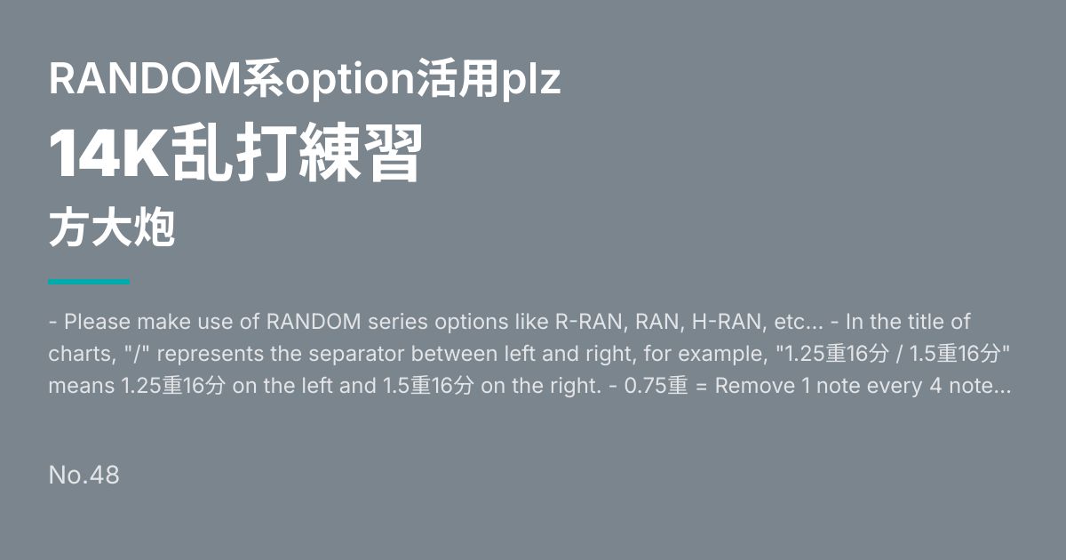 - Please make use of RANDOM series options like R-RAN, RAN, H-RAN, etc... - In the title of charts, "/" represents the separator between left and right, for example, "1.25重16分 / 1.5重16分" means 1.25重16分 on the left and 1.5重16分 on the right. - 0.75重 = Remove 1 note every 4 notes 1.25重 = Add 1 note every 4 notes 1.5重 = Add 2 notes every 4 notes 1.75重 = Add 3 notes every 4 notes 二重 = Double every note - The note density on the left is always less than or equal to that on the right. Make use of FLIP option if you want. Tell me in the comment what sabun you need. You can also make sabuns yourself. 14K乱打難易度表 by Telperion: https://raw.githubusercontent.com/telperion/egg/main/egg_analyzer.json