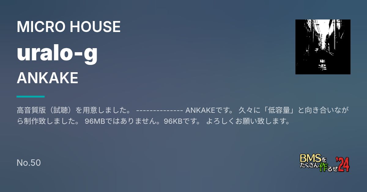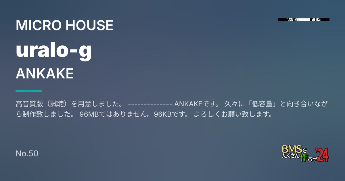 高音質版(試聴)を用意しました。 -------------- ANKAKEです。 久々に「低容量」と向き合いながら制作致しました。 96MBではありません。96KBです。 よろしくお願い致します。