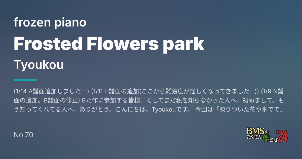 (1/14 A譜面追加しました!) (1/11 H譜面の追加(ここから難易度が怪しくなってきました…)) (1/9 N譜面の追加、B譜面の修正) Bた作に参加する皆様、そしてまだ私を知らなかった人へ、初めまして。もう知ってくれてる人へ、ありがとう。こんにちは。Tyoukouです。 今回は「凍りついた花や氷でできた花が入り混じる庭園」をイメージさせるような音楽を作りました。月唄の時同様、快くBGIを担当してくれたつなりあちゃんにここで感謝を申し述べます。ありがとう! …さて、Soundcloudの音日記の方を見てくれれば分かるのですが、最初は数十秒のみの楽曲でした。なので、これが実質的なロングバージョンとなります。 高難易度譜面は後ほど追加していきます。もしかしたらインプレ期間に差し掛かるかもしれません。少しこごえるかもしれませんが、是非くつろいでいってください。何卒よろしくお願いします。 (P.S. 今年の冬が終わってあたたかくなったら、きっとこの庭園はお水だらけかもしれませんね。 flooded flowers park…なんてね。) [Tyoukou] もしこんな綺麗な公園に出会える機会があったなら、うどんとか食べたいですよね。 ちょーこーさんと出るのは2回目! 寒さに気をつけて、沢山遊んでくれると嬉しいです よろしくお願いします [つなりあ]