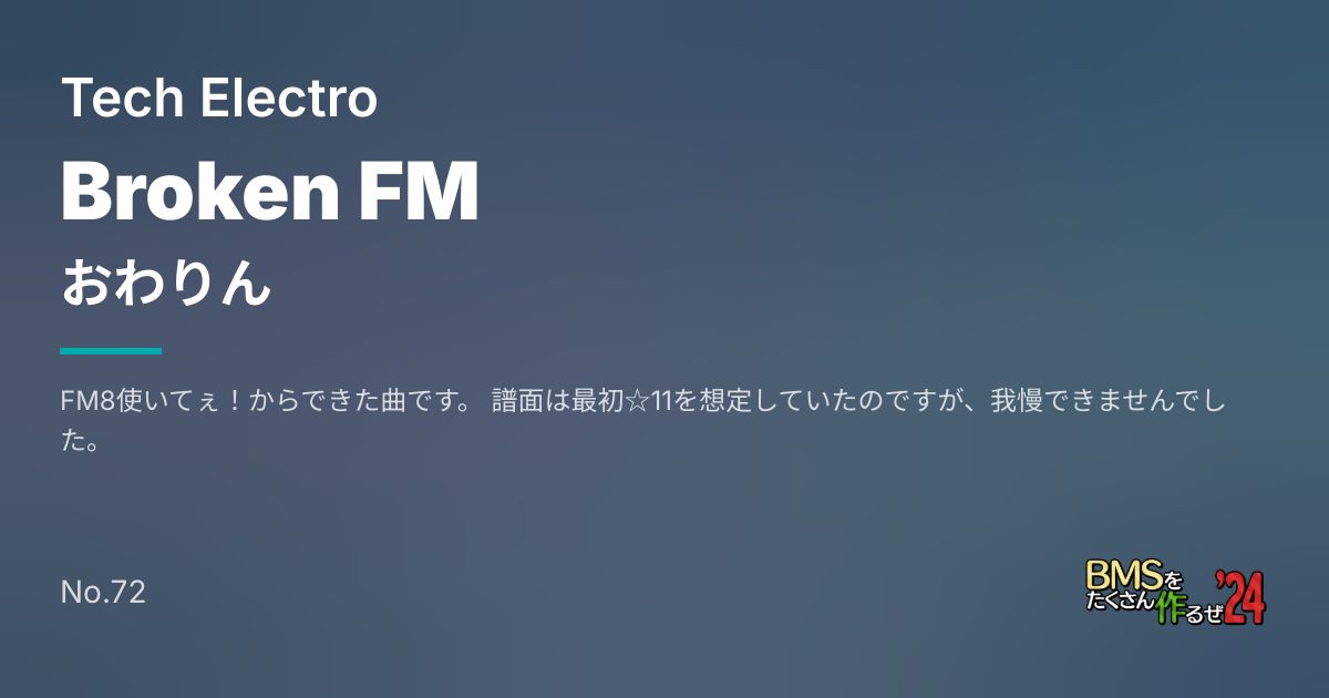 FM8使いてぇ!からできた曲です。 譜面は最初☆11を想定していたのですが、我慢できませんでした。