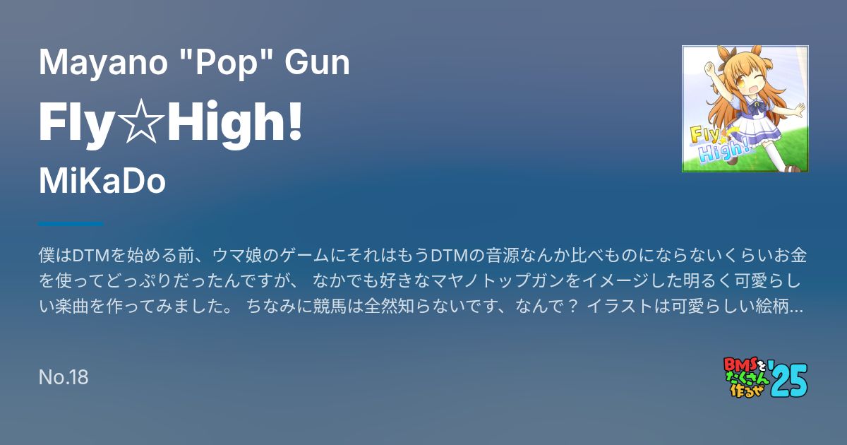僕はDTMを始める前、ウマ娘のゲームにそれはもうDTMの音源なんか比べものにならないくらいお金を使ってどっぷりだったんですが、 なかでも好きなマヤノトップガンをイメージした明るく可愛らしい楽曲を作ってみました。 ちなみに競馬は全然知らないです、なんで? イラストは可愛らしい絵柄が素敵なLLRKさんに描いてもらいました!本当にありがとうございます! 譜面の方はマヤノトップガンの代表的なレースである、有馬記念と天皇賞(春)の走行距離と同じノーツ数のものを用意してみました。 なかなか体力を使う譜面になりましたが、マヤがステイヤーなので許してほしいです(?) (天皇賞はノーツ数合わせるのを優先した結果、難易度バランスがあまり良くないので難易度表記0にしてます、すいません!) -DIFFICULTY- SP BEGINNER ☆2 SP NORMAL ☆5 SP HYPER ☆9 SP ANOTHER ☆11 SP 有馬記念 ★5 SP 天皇賞(春) ★0 9K NORMAL ☆28 9K HYPER ☆41 9K EX ☆47 FlyHigh.bmsbは未配置ファイルになっています。拡張子を.bmsに変更し差分作成等にご利用ください。
