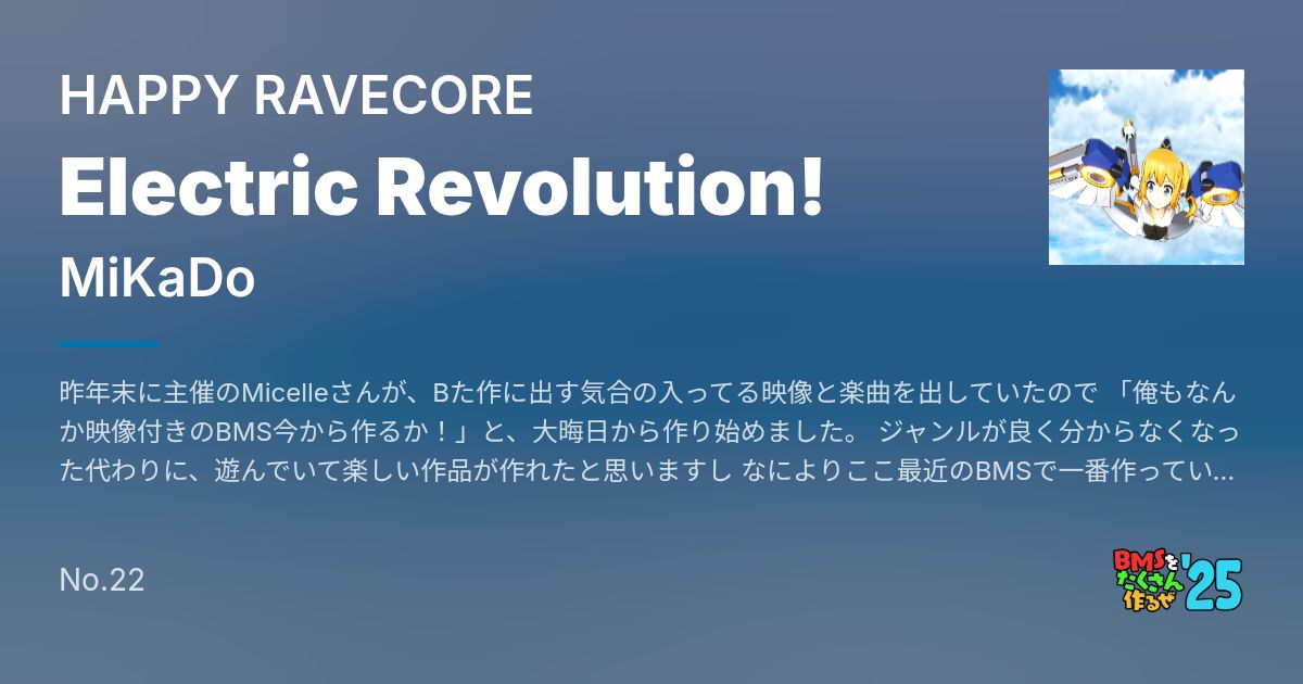 昨年末に主催のMicelleさんが、Bた作に出す気合の入ってる映像と楽曲を出していたので 「俺もなんか映像付きのBMS今から作るか!」と、大晦日から作り始めました。 ジャンルが良く分からなくなった代わりに、遊んでいて楽しい作品が作れたと思いますし なによりここ最近のBMSで一番作っていて楽しかったですね~! (全く意図していなかったんですが、INSANE譜面が2025ノーツになってました。あけましておめでとうございます。) BGAのモデルは、HSTT様のものをお借りしています。 -DIFFICULTY- SP BEGINNER ☆2 SP NORMAL ☆6 SP HYPER ☆10 SP ANOTHER ☆12 (★2) SP INSANE ★11 ★24、9鍵3種譜面追加終わりました!(2025/01/11) アーカイブ修正していいのか分からないので、別URLを置いてあります。 アーカイブ修正しても大丈夫そうだったので本体URLにも追加しました。(2025/01/21) SP 100万ボルト ★24 9K NORMAL ☆29 9K HYPER ☆43 9K EX ☆48 ElectricRevolution.bmsbは未配置ファイルになっています。拡張子を.bmsに変更し差分作成等にご利用ください。