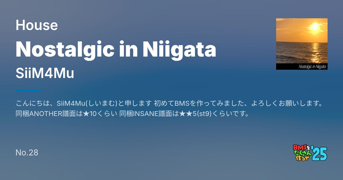 こんにちは、SiiM4Mu(しいまむ)と申します 初めてBMSを作ってみました、よろしくお願いします。 同梱ANOTHER譜面は★10くらい 同梱INSANE譜面は★★5(st9)くらいです。