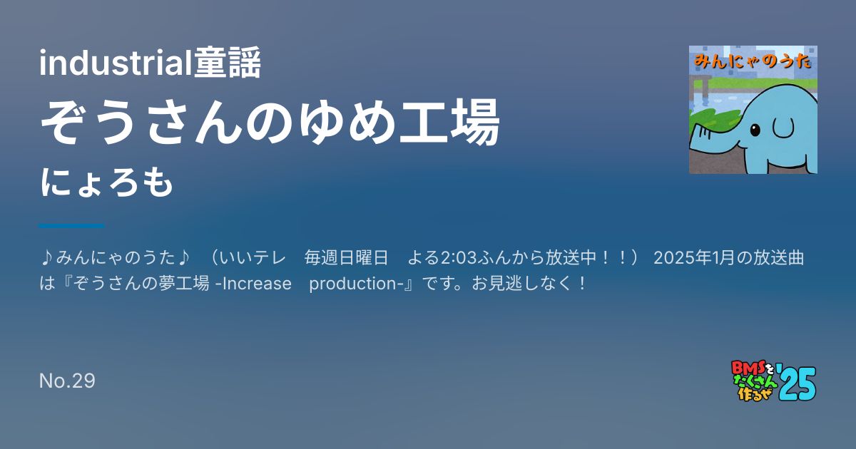 ♪みんにゃのうた♪ (いいテレ 毎週日曜日 よる2:03ふんから放送中!!) 2025年1月の放送曲 は『ぞうさんの夢工場 -Increase production-』です。お見逃しなく!