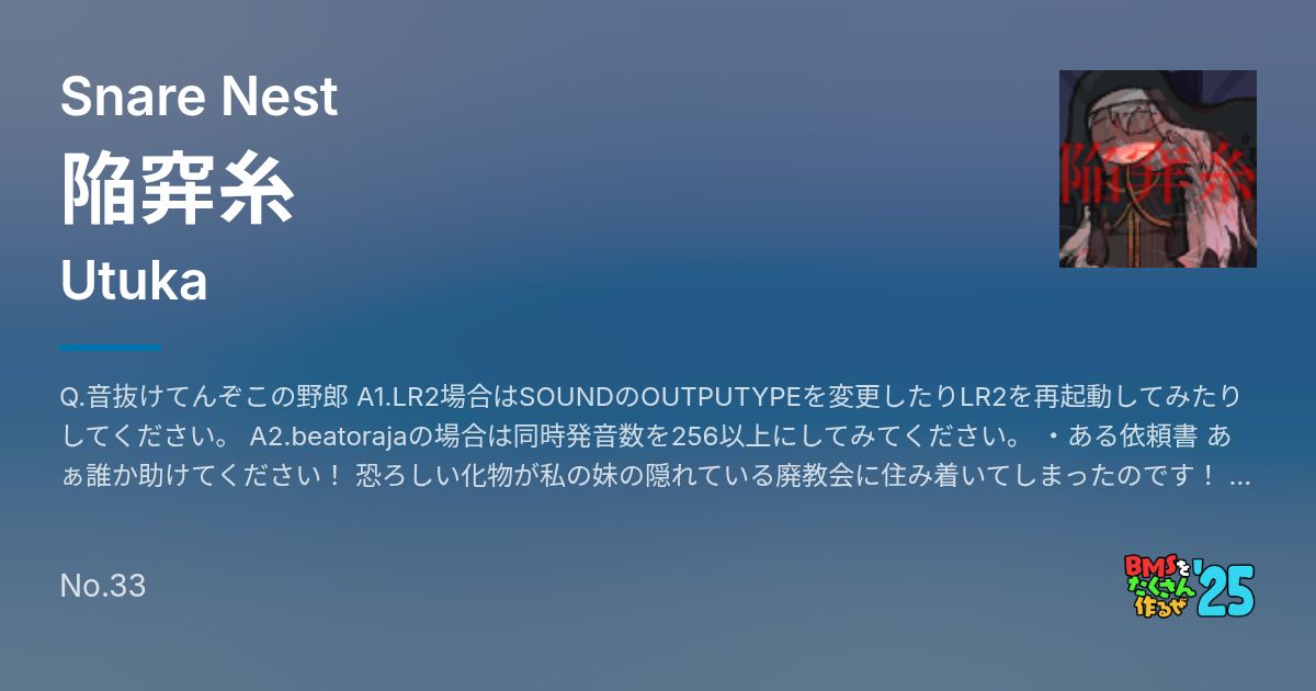 Q.音抜けてんぞこの野郎 A1.LR2場合はSOUNDのOUTPUTYPEを変更したりLR2を再起動してみたりしてください。 A2.beatorajaの場合は同時発音数を256以上にしてみてください。 ・ある依頼書 あぁ誰か助けてください! 恐ろしい化物が私の妹の隠れている廃教会に住み着いてしまったのです! 妹はもう一週間以上帰ってきていません…… 以前アレと戦った者によると炎の類は一切効かず正面から戦ってくるそうです。 妹は"修道女のような恰好"をしています。 どなたか妹を助けてください! 目標:妹と呼ばれる人物の救出 報酬:XXXXXXXXXXXXXXXXXXXXXX 陥穽糸(かんせいいと) [Normal] ☆7周辺 [Hyper] ☆9周辺 [Another]☆12周辺 [蜘蛛糸10000メートル]☆? 当時の私のreadme コレOracleよりも前に作ったのでBMS作った順としては三作目なんですよね、 このreadme書いてる時点でもう東方音弾遊戯も出し終えてて時の流れを感じます。 全体的な譜面傾向としてはLNをメインに据えています、なので全難易度でちょっと乱打は控えめになっています。 未来の私の追記 BOFで2パターン作った内の片方がこれです、両方かなり気に入っているのでどっち出すかかなり悩んだ、 こちらもゴシックな味。 向こうのテーマがベーシックな乱打発狂に対しこちらのテーマはLN譜面となっています。