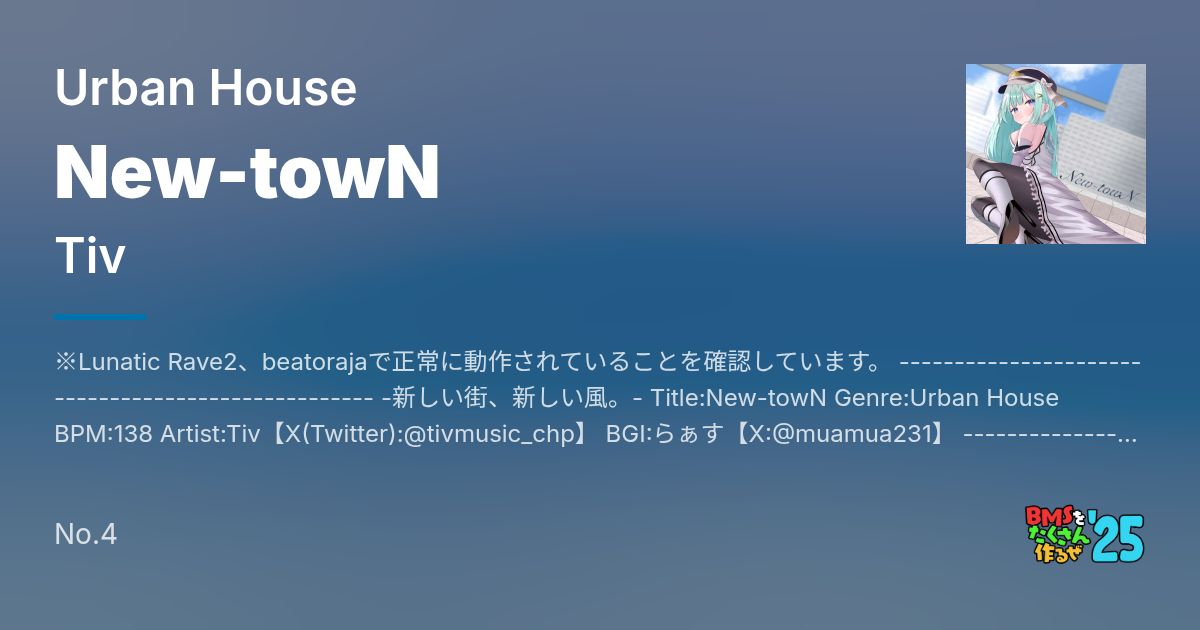 ※Lunatic Rave2、beatorajaで正常に動作されていることを確認しています。 --------------------------------------------------- -新しい街、新しい風。- Title:New-towN Genre:Urban House BPM:138 Artist:Tiv【X(Twitter):@tivmusic_chp】 BGI:らぁす【X:@muamua231】 --------------------------------------------------- Artist:Tiv 今年のBた作は5作品あります…え、5作品??? ホントです、Tivちゃん頑張りました。 作り置きなのでやる会に出した「ULT!MA×F!RE」はFL Studioで作ったのとは違い、Bた作の5作品はMusicLine+αで作っているので、クオリティでは劣るかもしれませんが、どれも気合い入れて作ったし、今聴いてもめっちゃ好きです。 そんな中トップバッターはハウス。花便りの「lale」でちょっと味を占めたのでもっかいくらいハウス作りたいなと思って、去年のBた作に出した「CyanPort」とちょっと絡め合わせた雰囲気にしてみました。 テーマはそのまんま「ニュータウン」です。 1970~80年代あたりに山岳地帯を切り開いて住宅街を作る、といった感じでしょうか。大体のニュータウンはもうできてから4~50年は経っていると思うんですが、その当時の街の雰囲気が好きすぎてですね…個人的に曲にしやすそうと思ってて、実際結構筆も速かったです。 曲としては、エモさと美しさを全面に、リズム感が良くなるよう、ハウスっぽい音も積極的に入れつつ、近代的な雰囲気になるようにも意識しています。 昔の人が考える近未来、について想像を膨らませてみました。 BGIは今回らぁすさんにお願いしました。この度はありがとうございました! ビル群がそびえ立つ近代的な街並みを背に、かわいらしい見た目の女の子。 衣装もホントに近未来っぽさがあって最高です。 譜面は全体的には難易度低めです。こういうのやってみたかったんですよね? EXTREME以上は地力寄りの譜面になるように作りました。 BPM遅めなので16分なのにちょっと横に広い感じになってます。 X(Twitter)(気ままに更新中) https://twitter.com/tivmusic_chp SoundCloud(色々上げたり上げなかったり) https://soundcloud.com/tivremisuke note(たまーにブログ的な何かを。過去のBMSも保管中) https://note.com/tiv_03sk YouTube(BGAや音源などを気まぐれで投稿) https://www.youtube.com/channel/UC3pMoThTt8gpoAHPsNfIi8Q 連絡用メアド(TwitterのDMが出来ない場合の問い合わせやリンク切れ報告に) tivdirectmass@gmail.com --------------------------------------------------- BGI:らぁす 今回描いたイラストは曲のキャッチフレーズである新しい街、新しい風に合うように描きました。 曲の雰囲気を崩さずに少し色気もあり魅力的に描けたので自分でも気に入ってます!