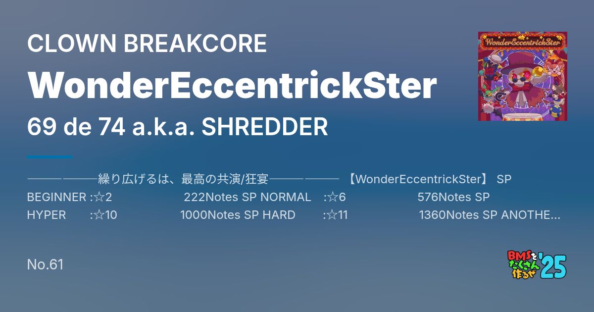 ――――――繰り広げるは、最高の共演/狂宴―――――― 【WonderEccentrickSter】 SP BEGINNER :☆2 222Notes SP NORMAL :☆6 576Notes SP HYPER :☆10 1000Notes SP HARD :☆11 1360Notes SP ANOTHER :☆12(★8/sl5) 2000Notes SP INSANE :★12(sl7) 2345Notes DP BEGINNER :☆1 192Notes DP NORMAL :☆7 749Notes DP HYPER :☆10(10.2-5) 1124Notes DP HARD :☆12.0(★2/sl2) 1557Notes DP ANOTHER :☆12.5(★7/sl7) 2035Notes 9Key EASY :LV9 206Notes 9Key NORMAL :LV29 504Notes 9Key HYPER :LV40 909Notes 9Key EX :LV47 1322Notes 9Key PLUS :LV50 2000Notes このイベントでは去年に引き続きでの参加です。ロクデナシです。 SHREDDERとも言います。Mutual Faith 2(2018年)以来ですってよ! 今回は、BOF:TTに出した「EccentrickSter」のセルフアレンジ版、 もとい、向こうが道中BGMとしたらこちらはボス戦BGMを意識した、 バキバキでありつつもepicな雰囲気の漂うBREAKCOREです。 大いなる力を持ちし金色のオーブによって蘇ったサーカス団。 しかし、そのオーブの真の持ち主として相応しいかを問うため、 雌雄を決する戦いが今、幕を開ける…!的なノリでお楽しみ頂けると幸いです。 BGAに関してはれおんさんに作って頂きました。 ピエロの団長の大魔法に加え、はるかぜ組のイメージキャラを模したサーカス団員達が、 召喚魔法で大暴れしまくるスーパーワチャワチャBGAとなっております。 また、こちらのBGA、beatorajaですと1:1よりも左右が広い事を活かして、 戦闘画面のUIが表示されてより一層没入感が高まると思うので、 こちらも是非是非お楽しみ頂ければ幸いです。 原曲に引き続き、DP譜面はよーすくさん、9K譜面はY.Wさんに制作して頂きました。 この場をお借りして感謝申し上げます。