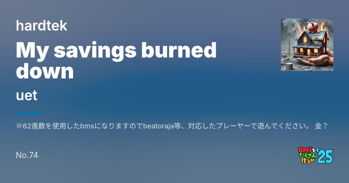 ※62進数を使用したbmsになりますのでbeatoraja等、対応したプレーヤーで遊んでください。 金?ねぇよそんなモン enough譜面をsuna、もといnakaiankow氏に制作していただきました。ありがとうございますこいつ絶対ビギナーじゃないだろ (通常3譜面BGIは画像生成AI、enough譜面BGIはsuna氏制作) 曲名ははっちゃん(@a_one_eighth)命名