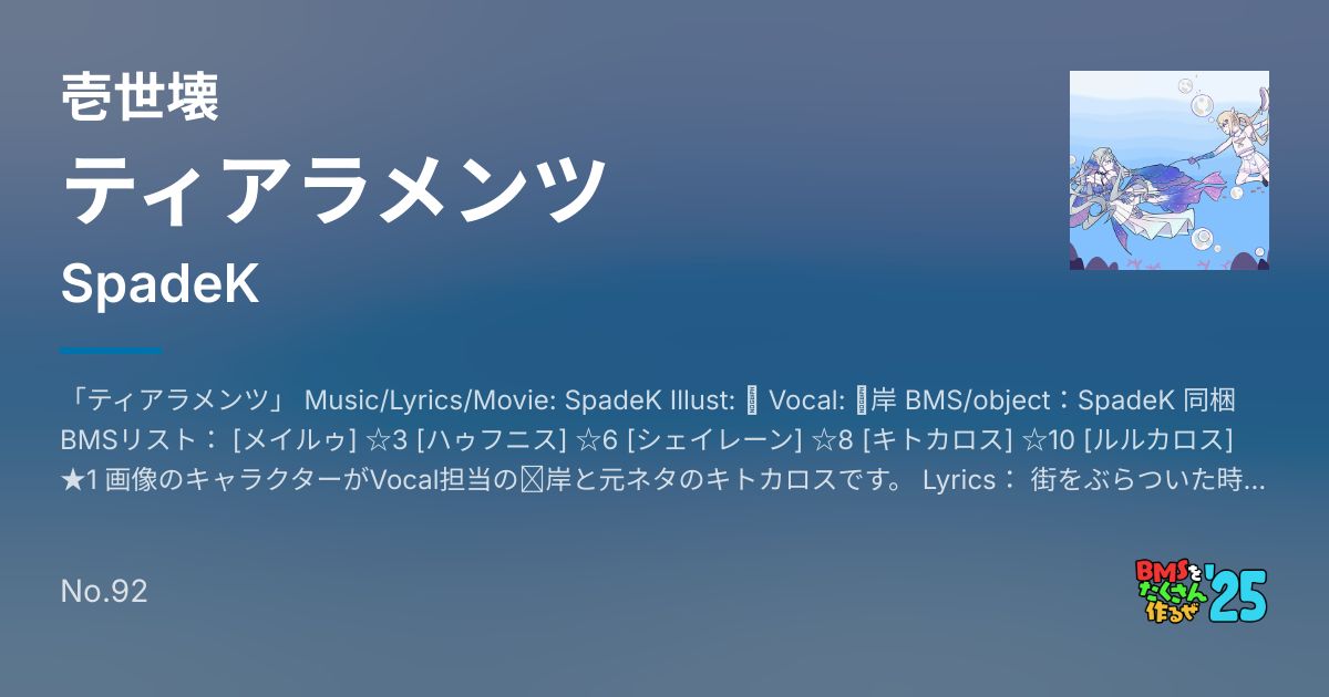 「ティアラメンツ」 Music/Lyrics/Movie: SpadeK Illust: 邻 Vocal: 诗岸 BMS/object:SpadeK 同梱BMSリスト: [メイルゥ] ☆3 [ハゥフニス] ☆6 [シェイレーン] ☆8 [キトカロス] ☆10 [ルルカロス] ★1 画像のキャラクターがVocal担当の诗岸と元ネタのキトカロスです。 Lyrics: 街をぶらついた時に 月明かりに迷いました 東を向いて歩けば 慟哭のような歌声が聞こえている あの声が気になる時に 広い浜が目に映った 華麗な輝き飾る 泣きそうな顔の紺碧の少女達だ 水面に佇む思いの彼は 少女の心象を写す 不思議に思った すぐ涙の波に呑み込まれた Sha-ri-la 踊りながら 歌いながら 不協和音と共鳴した Sha-ri-la 弦に合わせた 波に合わせた アイの讃歌を上げた Sha-ri-la あの賑やかな 渦巻きの中 息が絶えるようだ Sha-ri-la Ta-ri-la-lu-da-ri-la 水面が澄んだ 残響だけ聞いた -Break- (以下はFull Versionのみ) それは昔の話だ 悲しい声と安易な言葉 歌に誘われたら 海で踊るその姿を見つけた 華麗なティアラを渡した すぐに頭上被った 思わず涙を流して 口ずさんだ Sha-ri-la 踊りながら 歌いながら 不協和音と共鳴した Sha-ri-la 弦に合わせた 波に合わせた アイの讃歌を上げた Sha-ri-la あの賑やかな 渦巻きの中 息が絶えるようだ Sha-ri-la Ta-ri-la-lu-da-ri-la 水面が澄んだ 残響だけ聞いた -Fin-