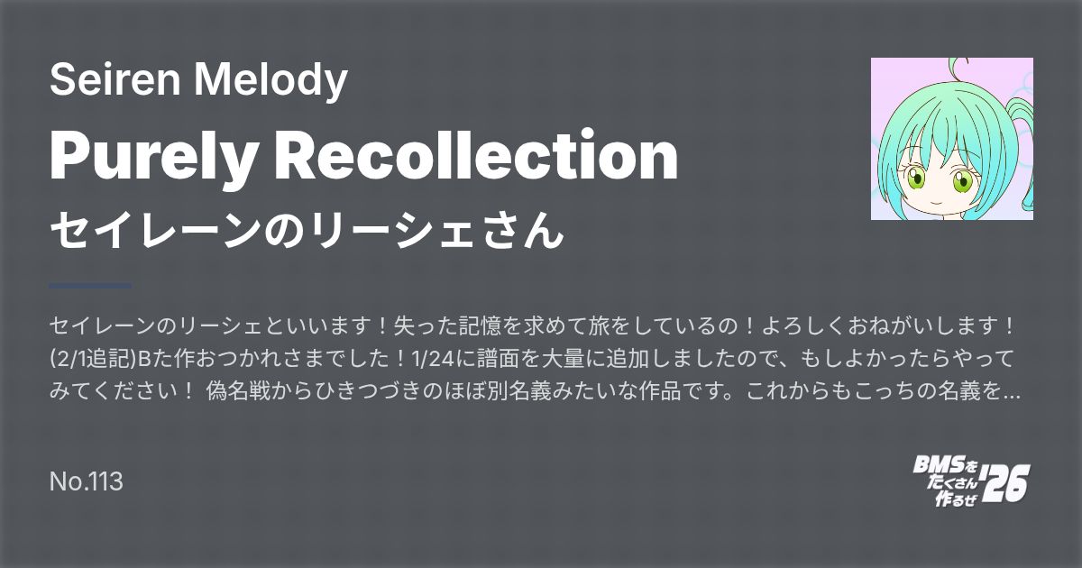 セイレーンのリーシェといいます!失った記憶を求めて旅をしているの!よろしくおねがいします! (2/1追記)Bた作おつかれさまでした!1/24に譜面を大量に追加しましたので、もしよかったらやってみてください! 偽名戦からひきつづきのほぼ別名義みたいな作品です。これからもこっちの名義を使っていくことがあると思うので、よろしくおねがいします。 みなさんプレイ&インプレありがとうございました!