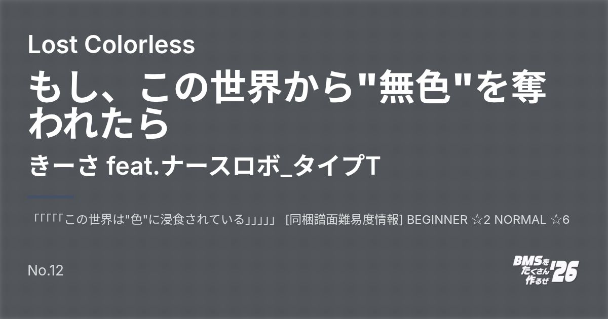 「「「「「この世界は"色"に浸食されている」」」」」 [同梱譜面難易度情報] BEGINNER ☆2 NORMAL ☆6 HYPER ☆11 ANOTEHR ☆12(sl1) INSANE ★10?(sl6?) Colorless ★23?(st3?) Lost Colorless ★25?(st7?) ------- ★99(鑑賞用)