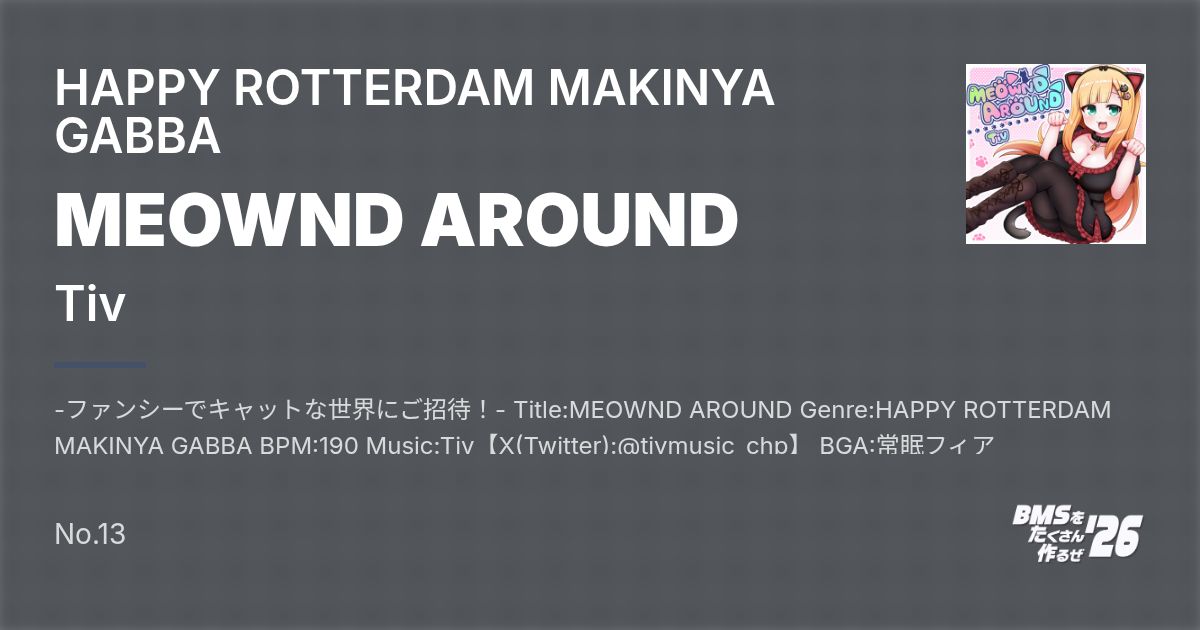 -ファンシーでキャットな世界にご招待!- Title:MEOWND AROUND Genre:HAPPY ROTTERDAM MAKINYA GABBA BPM:190 Music:Tiv【X(Twitter):@tivmusic_chp】 BGA:常眠フィア【X:@NemuiFia】 Illust:七峰七緒【X:@nnmn70】 Special Thanks:potechang【X:@pt10_】(発狂譜面制作) ※Lunatic Rave2、beatorajaで正常に動作されていることを確認しています。 ※当BMSでは#LNMODE 2定義を使用しており、対応プレーヤーではチャージノーツでお楽しみいただけます。 ※BGAについては、beatoraja向けの高画質版(mp4)と、LR2向けの低画質版(wmv)を用意しています。 容量が気になる方は不要なほうを削除することを推奨します。 --------------------------------------------------- 譜面一覧 7keys BEGINNER ☆3 NORMAL ☆5 HYPER ☆10 ANOTHER ☆11 CAT HEAVEN(INSANE) ★19(制作:potechang) --------------------------------------------------- comment Music:Tiv DLありがとうございます。動物に触れるのはものすごく苦手なTiv(てぃぶ)です。 ちなみに昔は犬に吠えられやすかったです。 …という前置きをしておきながら、この曲の題材は猫です。 猫っぽいサウンドや、ピコピコ音など、全体的に可愛らしく仕上げました。 ジャンル名はかなりカオスなことになってます。 その名も「HAPPY ROTTERDAM MAKINYA GABBA」なんだこのキメラは。 かわいらしい雰囲気とマキナっぽい雰囲気を混ぜ合わせて、その中にガバとかロッテルダムテクノとか、前者とは正反対のジャンルを溶け込ませてます。 まあでもガバキックはなんかピコピコ音と結構マッチしてると思うんですよね。 声ネタの豊富さにも力を入れてます。リズム感の良い編集頑張りました。 ちなみに声ネタも全て音切りしているんですが…。 映像は常眠フィアさん、イラストは七峰七緒さんにお願いさせていただきました。 お二方、この度はありがとうございました! 登場する女の子が、しっかり猫コーデしてるので、大量の猫が追いかけて、戯れて…ロッテルダムテクノの曲とは正反対に、癒されるものとなってます。 懐かしい(?)ミームな動きにも注目です。 可愛らしくてカラフルなロゴはフィアさん作です。猫らしさも満載! 二人でここまで細かく仕上げてくださって、本当に感謝しかないです…! また、st0相当の発狂譜面をpotechangさんに依頼させていただきました。ありがとうございました! キュートながらも若干ハードコアテクノの風味が垣間見える、キャッチーな力作をお楽しみいただけると幸いです。 差分譜面制作は、同梱のノーツ未配置ファイル(_none)からがおすすめです。 拡張子が「bmstemp」となっていますので、適宜変更してご利用ください。 報告は不要ですが、していただけると見に行きます。むしろ見たいです() ポータルサイト(これを見ればTivがどんな人か大体わかる) https://sukestonepyua.wixsite.com/tivsukehome X(Twitter)(気ままにつぶやいたり宣伝したり) https://twitter.com/tivmusic_chp SoundCloud(音源保管はこちらで) https://soundcloud.com/tivremisuke YouTube(BGAや音源などを気まぐれで投稿) https://www.youtube.com/channel/UC3pMoThTt8gpoAHPsNfIi8Q 連絡用メアド(TwitterのDMが出来ない場合の問い合わせやリンク切れ報告に) tivdirectmass@gmail.com --------------------------------------------------- BGA:常眠フィア こんにちは、常眠フィアです。 BGAとロゴを担当しました。 音に合わせてウゴウゴ動かすのが楽しかったです! --------------------------------------------------- Illust:七峰七緒 一生ぶんの猫を描きました。ヒロインみたいに猫に好かれたい…