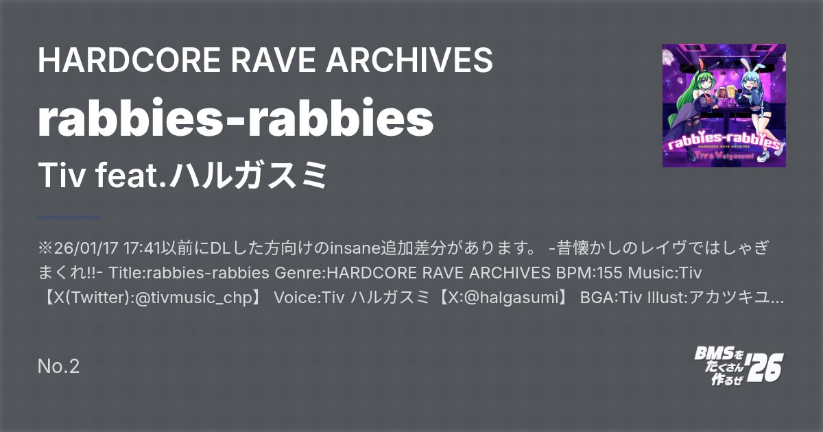 ※26/01/17 17:41以前にDLした方向けのinsane追加差分があります。 -昔懐かしのレイヴではしゃぎまくれ!!- Title:rabbies-rabbies Genre:HARDCORE RAVE ARCHIVES BPM:155 Music:Tiv【X(Twitter):@tivmusic_chp】 Voice:Tiv ハルガスミ【X:@halgasumi】 BGA:Tiv Illust:アカツキユウ【X:@akatsuki_yu】 ※Lunatic Rave2、beatorajaで正常に動作されていることを確認しています。 ※BGAについては、beatoraja向けの高画質版(mp4)と、LR2向けの低画質版(wmv)を用意しています。 容量が気になる方は不要なほうを削除することを推奨します。 --------------------------------------------------- 譜面一覧 7keys BEGINNER ☆1 NORMAL ☆6 HYPER ☆9 ANOTHER ☆10 DRUNK FESTIVAL!! 発狂向け(☆13) --------------------------------------------------- comment Music:Tiv DLありがとうございます。炭酸に魅せられすぎて、20になっても酒を飲む気配がなさそうなTiv(てぃぶ)です。 あと10ヶ月…?うそだろ… まさかの!ハルガスミさんとの!!再コラボでございます!!!呑み屋ハルガスミ出張店ということで…。 「飲んだくれの青ウサギ」でははっちゃけすぎたので、今度はややおとなしめな感じでもう一つガスミさんボイスのある曲を作りたいなと思ったんですけど…やっぱりはっちゃけは避けられませんでした…。 でもそれでこそハルガスミさんだから!というわけで今回も、色々と付き合っていただきありがとうございました!! 曲としては懐かしさを感じるようなレイヴをBGMに、クラブでMCトークしてるような感じを構想しました。 トーク内容は昨年6月にハルガスミさんのチャンネルにて実施した雑談配信のものを使用しております。結構カオスなので良ければアーカイブの方を是非↓ https://www.youtube.com/live/1huJe3oSrMQ?si=3WZ-xuHELk6Ts10H ある曲をリスペクトしていて、キー音数の割にはかなり作りんでいる自信があります。 そして中盤には乾杯の音頭がありますので、余裕のある方はビール片手に画面に向かって、もしくは近くの酒呑みの方と乾杯してみてはいかがでしょうか? イラストはアカツキユウさんにお願いさせていただきました。この度はありがとうございました! 言葉では表しづらい最高な姿の2人がジョッキを交わしてるんですよ。めちゃくちゃ良くないすか??? ちなみに私は現地点で19歳なので、ビールではなくコーラでオーダーさせていただきました。 あと、笑顔がかわいいですよねェ… ウサギとウサギのやかましい会話とアツアツのレイヴで盛り上がっていただけますと幸いです。 差分譜面制作は、同梱のノーツ未配置ファイル(_none)からがおすすめです。 拡張子が「bmstemp」となっていますので、適宜変更してご利用ください。 報告は不要ですが、していただけると見に行きます。むしろ見たいです() ポータルサイト(これを見ればTivがどんな人か大体わかる) https://sukestonepyua.wixsite.com/tivsukehome X(Twitter)(気ままにつぶやいたり宣伝したり) https://twitter.com/tivmusic_chp SoundCloud(音源保管はこちらで) https://soundcloud.com/tivremisuke YouTube(BGAや音源などを気まぐれで投稿) https://www.youtube.com/channel/UC3pMoThTt8gpoAHPsNfIi8Q 連絡用メアド(TwitterのDMが出来ない場合の問い合わせやリンク切れ報告に) tivdirectmass@gmail.com --------------------------------------------------- Voice:ハルガスミ Tivさんがまた面白い楽曲を作ってくれました!愛してくれてありがとうございます――― 対談配信中に録音したので、トークやセリフが『飲んだくれの青ウサギ』の時より自然になってます! でも当時はあれが本気だったんです・・・やっぱり何事も自然体でいることが大事ですね! ハルガスミ@halgasumi --------------------------------------------------- Illust:アカツキユウ デッカ×デッカうさぎさんズを描かせていただきました! アゲてけRAVE! カンパーイ! アカツキユウ@akatsuki_yu