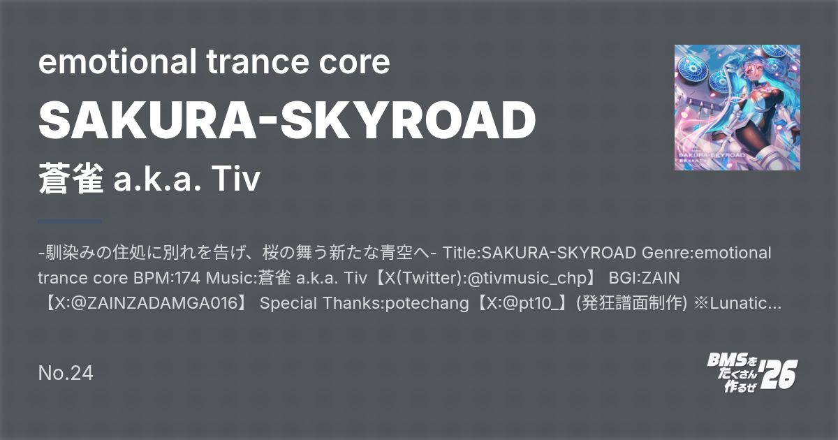 -馴染みの住処に別れを告げ、桜の舞う新たな青空へ- Title:SAKURA-SKYROAD Genre:emotional trance core BPM:174 Music:蒼雀 a.k.a. Tiv【X(Twitter):@tivmusic_chp】 BGI:ZAIN【X:@ZAINZADAMGA016】 Special Thanks:potechang【X:@pt10_】(発狂譜面制作) ※Lunatic Rave2、beatorajaで正常に動作されていることを確認しています。 --------------------------------------------------- 譜面一覧 7keys BEGINNER ☆1 NORMAL ☆6 HYPER ☆10 ANOTHER ☆11 Everlasting(INSANE) ★22(制作:potechang) --------------------------------------------------- comment Music:蒼雀 a.k.a. Tiv ダウンロードしていただき…ありがとうございます…。 蒼雀です…ご無沙汰しております…。 …え?「お前女の子じゃないだろ」…って? フッフッフッ…かわいいもじもじ系の女の子だと思った?残念、やべぇ男ことTiv(てぃぶ)でした。 まだデビューから2ヶ月くらいしかないのに、蒼雀名義の楽曲2つ目でございます。 タイトルや雰囲気からわかる通り、BOF21の「SKY PASSAGEWAY」の続編です。 とにかくエモくて涙腺を刺激する曲を作りたくて、そのときに「SKY PASSAGEWAYの雰囲気に合わせてそういうのやったら、めちゃくちゃ良くなるんじゃね?」って思い、作ってみたら、ちょい泣きしました。マジです。 ちなみに、個人的にはピアノソロにはかなり自信があります。 蒼雀らしさを意識しながらも、偽名ではないので「Tiv」としての味もふんだんに出させていただきました。 イラストはZAINさんにお願いさせていただきました。この度はありがとうございました! 機械的な装備で空を飛ぶ女の子を想定しておりまして、エモさありつつもビジュアルも良くてめちゃくちゃお気に入りです! (一応注釈しておきますが、この子は蒼雀ではないです) また、st2相当の発狂譜面をpotechangさんに依頼させていただきました。ありがとうございました! 別れも美しくエモく…を意識した感動の一作をお楽しみいただけると幸いです。 差分譜面制作は、同梱のノーツ未配置ファイル(_none)からがおすすめです。 拡張子が「bmstemp」となっていますので、適宜変更してご利用ください。 報告は不要ですが、していただけると見に行きます。むしろ見たいです() ポータルサイト(これを見ればTivがどんな人か大体わかる) https://sukestonepyua.wixsite.com/tivsukehome X(Twitter)(気ままにつぶやいたり宣伝したり) https://twitter.com/tivmusic_chp SoundCloud(音源保管はこちらで) https://soundcloud.com/tivremisuke YouTube(BGAや音源などを気まぐれで投稿) https://www.youtube.com/channel/UC3pMoThTt8gpoAHPsNfIi8Q 連絡用メアド(TwitterのDMが出来ない場合の問い合わせやリンク切れ報告に) tivdirectmass@gmail.com --------------------------------------------------- BGI:ZAIN 「SAKURA-SKYROAD」のジャケットイラストを担当させていただきましたZAIN(ゼイン)です! Tivさんの素敵な楽曲にジャケットイラストという形で携わることが出来て嬉しいです! 楽曲の世界観を大切にしながら、キャラクターデザインから丁寧に制作しました。細部までしっかり描いているのでじっくり眺めてみてください