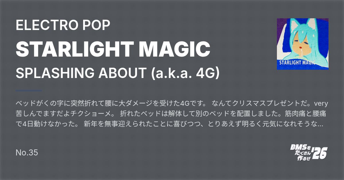 ベッドがくの字に突然折れて腰に大ダメージを受けた4Gです。 なんてクリスマスプレゼントだ。very苦しんでますだよチクショーメ。 折れたベッドは解体して別のベッドを配置しました。筋肉痛と腰痛で4日動けなかった。 新年を無事迎えられたことに喜びつつ、とりあえず明るく元気になれそうなものを公開したかったのです。 何せ去年の11月以降を時系列で箇条書きにすると、 ・赤信号を無視した車に突っ込まれ私含め5人が危うく轢かれかける ・身内にコロナを故意にうつされる ・ベッド破損で腰に大ダメージ ・某公募でありえないミスをかまし0回戦敗退 ・未開封のめんつゆが冷蔵庫内で蓋が破損して倒れめんつゆまみれに ・夜に階段を下りてる最中にて電灯が事故で消え足を踏み外す ついでに新年おうちINF全譜面乱セレクトで卑弥呼穴引きました。心折れました。 ともかく、明るく元気になれる曲を公開したかった。じゃないと新年早々気が滅入る。 という訳で去年に作ったカワイイフューチャーベース的なものを目指した産物をBMS化しましたが フューチャーでもベースでもないあたり何とも言えない気分。シンセの音作りワカンネ。 あいも変わらずPMSはノープレーでフィニッシュです。コントローラないのねん。 Q.なんで難易度ごとにBPM違うの? A.特に理由はない。 Q.なんで最後はねてんの? A.どっかの公募用に作って落ちたから。そしてイラストに困る羽目になった。 念のために0回戦敗退したのとは別の曲だよ。そっちはまだ審査中だから公開できないよ。 Q.BGIなにこれ? A.こんなんでもペンタブで描いた絵やぞ。フォトショのフィルタ使いまくってごまかしまくってるけど。