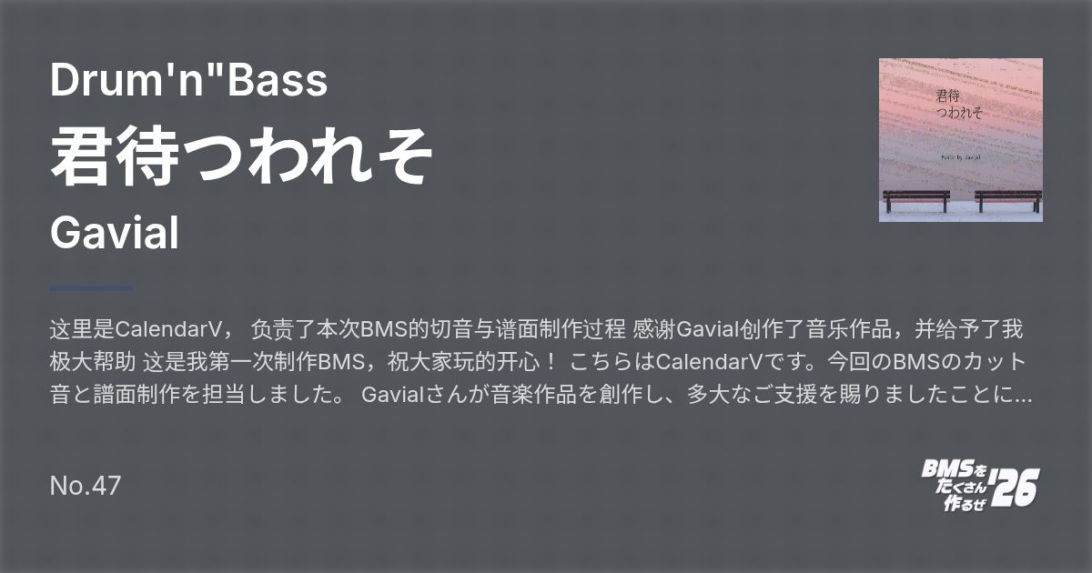 这里是CalendarV, 负责了本次BMS的切音与谱面制作过程 感谢Gavial创作了音乐作品,并给予了我极大帮助 这是我第一次制作BMS,祝大家玩的开心! こちらはCalendarVです。今回のBMSのカット音と譜面制作を担当しました。 Gavialさんが音楽作品を創作し、多大なご支援を賜りましたことに感謝申し上げます。 初めてのBMS制作となりますが、皆様が楽しんでプレイされますことを願っております! (翻訳ツールを使用) information: SPB:97note 180total SPN:667note 265total SPH:920note 260total SPA:1074note 375total 2026/1/12更新 追加了由MiyakoMeow先生制作的谱面差分 在此表示感谢! MiyakoMeow氏制作の譜面差分を追加しました。ここに感謝申し上げます!