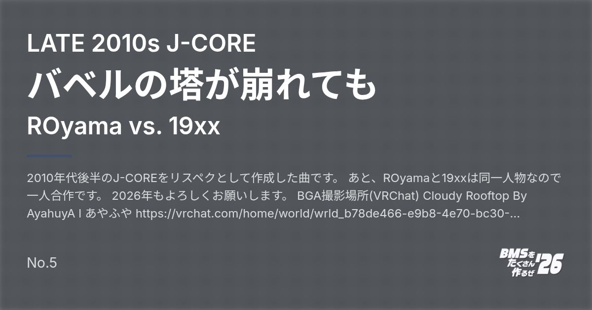2010年代後半のJ-COREをリスペクとして作成した曲です。 あと、ROyamaと19xxは同一人物なので一人合作です。 2026年もよろしくお願いします。 BGA撮影場所(VRChat) Cloudy Rooftop By AyahuyA l あやふや https://vrchat.com/home/world/wrld_b78de466-e9b8-4e70-bc30-85073af77452/info 連絡先 https://x.com/OyamaKur https://x.com/19noxxnosouko