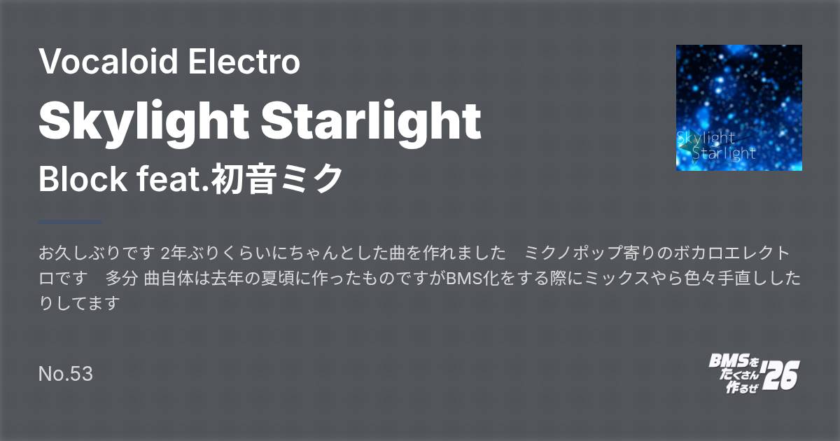 お久しぶりです 2年ぶりくらいにちゃんとした曲を作れました ミクノポップ寄りのボカロエレクトロです 多分 曲自体は去年の夏頃に作ったものですがBMS化をする際にミックスやら色々手直ししたりしてます
