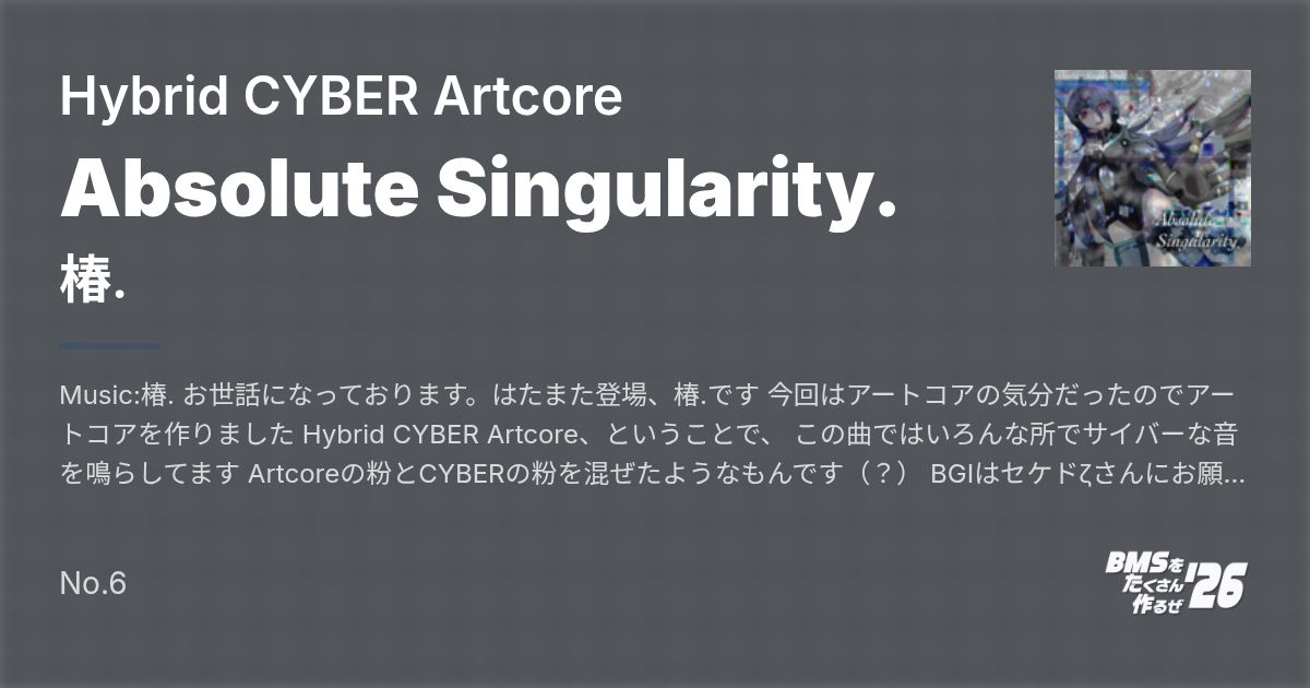 Music:椿. お世話になっております。はたまた登場、椿.です 今回はアートコアの気分だったのでアートコアを作りました Hybrid CYBER Artcore、ということで、 この曲ではいろんな所でサイバーな音を鳴らしてます Artcoreの粉とCYBERの粉を混ぜたようなもんです(?) BGIはセケドζさんにお願いしました。 素敵なイラストなので1日に5時間は見てください えっ?プレイするのが怖い!?ばっかおまえ...俺がついてるだろ ということで「Absolute Singularity.」をぜひ楽しんで頂けると幸いです。 よろしくお願いします! Illust:セケドζ イラストを担当させていただきました、セケドζです! 久々に女の子描きました。グリッチ描くの楽しかったです 少女「#AT-002」は変遷の果てに何を観測するのか。 「Absolute Singularity.」 Genre:Hybrid CYBER Artcore Music:椿.(@Tsubaking_DoT) Illust:セケドζ(@cot_zeta)
