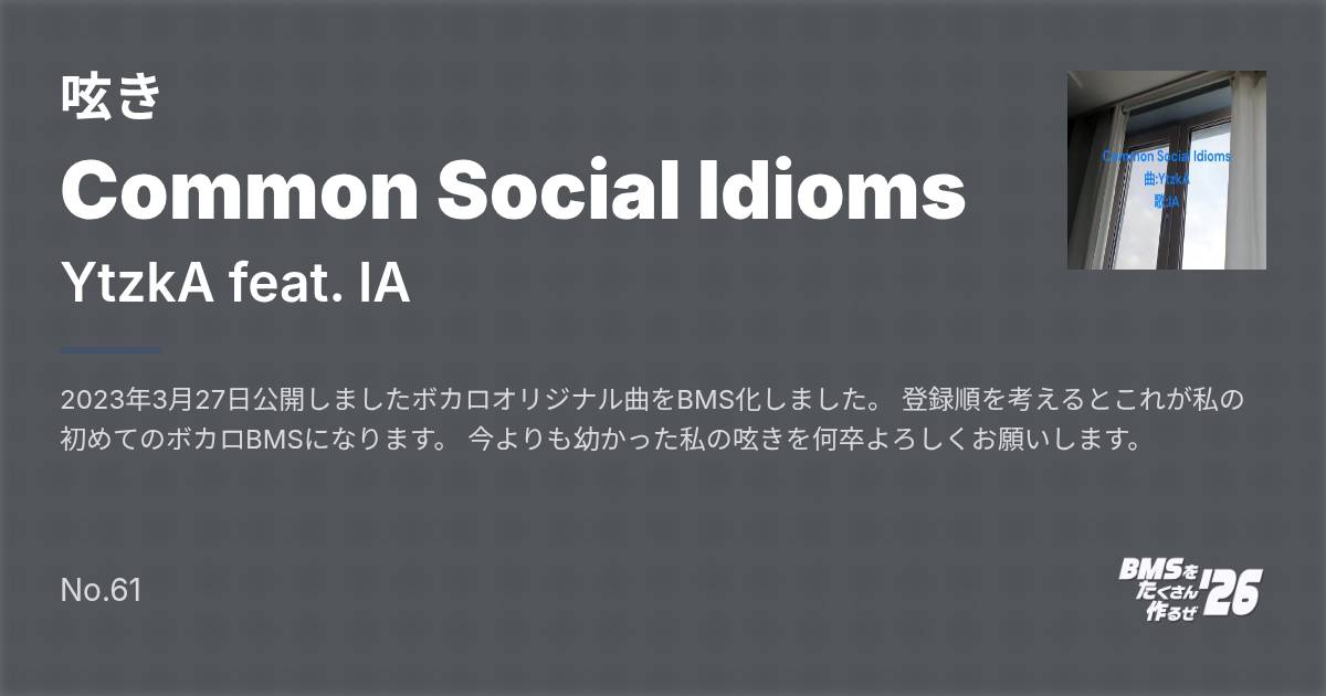 2023年3月27日公開しましたボカロオリジナル曲をBMS化しました。 登録順を考えるとこれが私の初めてのボカロBMSになります。 今よりも幼かった私の呟きを何卒よろしくお願いします。