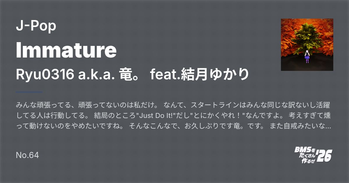 みんな頑張ってる、頑張ってないのは私だけ。 なんて、スタートラインはみんな同じな訳ないし活躍してる人は行動してる。 結局のところ"Just Do It!"だし"とにかくやれ!"なんですよ。 考えすぎて燻って動けないのをやめたいですね。 そんなこんなで、お久しぶりです竜。です。 また自戒みたいな歌詞書いてるよって感じです... 去年の9月末にあまりにも曲が書けず開き直りのごとく手癖!手癖!ウォー兎に角鳴らせ!って 伴奏とサビの歌詞まで終えてたものを今年に入って形にしました... DigitalなのかEUROBEATなのかわからなくなったためジャンルはJ-Popに。 本年もよろしくお願いします。 _______________________________________________________ Immature:未熟 _______________________________________________________ Lyric 僕は まだ 変われずに いる 青い 青い 未熟者 最初は 誰もが 同じだと 思っていた けれども どこかで 差がついて 日が当たり 目を出す者もいれば 日陰で燻る 僕がいる そう 周りは 変わってく 僕だけ 取り残され 赤く 染まり ゆく 木の葉たち 変わり ゆく世界に 僕は まだ 変われずに いる 青い 青い 未熟者 Immature