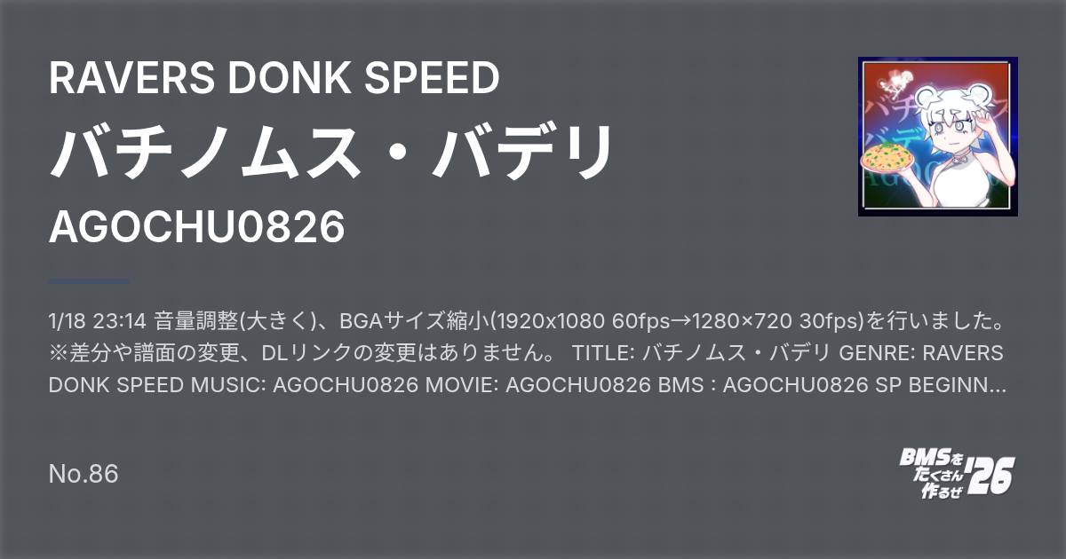 1/18 23:14 音量調整(大きく)、BGAサイズ縮小(1920x1080 60fps→1280x720 30fps)を行いました。 ※差分や譜面の変更、DLリンクの変更はありません。 TITLE: バチノムス・バデリ GENRE: RAVERS DONK SPEED MUSIC: AGOCHU0826 MOVIE: AGOCHU0826 BMS : AGOCHU0826 SP BEGINNER : ☆3 SP NORMAL : ☆6 SP HYPER : ☆10 SP ANOTHER: ☆12 SP INSANE : ☆12 ------------------------------------------- 年末に好きな漫画の単行本おまけ回を読んでいたら「バチノムス・バデリ」という言葉が! これはエントモファガ・グリリの続編を作らなければと思い制作に取り掛かりました。 バチノムス・バデリはつい最近見つかったオオグソクムシの新種で、顔がダースベイダーに似ていることからバデリ(vaderi)とつけられたそうですよ~ 楽曲はドンクベースを入れたかったのと、この前購入したWOW MACHINEというスクラッチができるデジタル楽器を使いたかったので皿マシマシになりました! いつも通りっぽいけど録音した自作のスクラッチなので味が出ているかもしれない(?) BGAは前作のグリリちゃんも登場しつつ、弟のバデリくんも登場するほのぼのストーリーにしてみました。 初めてストーリー仕立てのBGAを制作してみて、思っていたより必要なイラスト数が多くなり苦労しました。。。展開モリモリのBGA作ってるみなさんはすごい!!! ミスレイヤーは制作時の絵コンテになっているので、完成版と見比べてみてくださいねb 2026/01/16 AGOCHU0826 (@erukays_oga) ------------------------------------------- LR2とbeatorajaで動作確認済