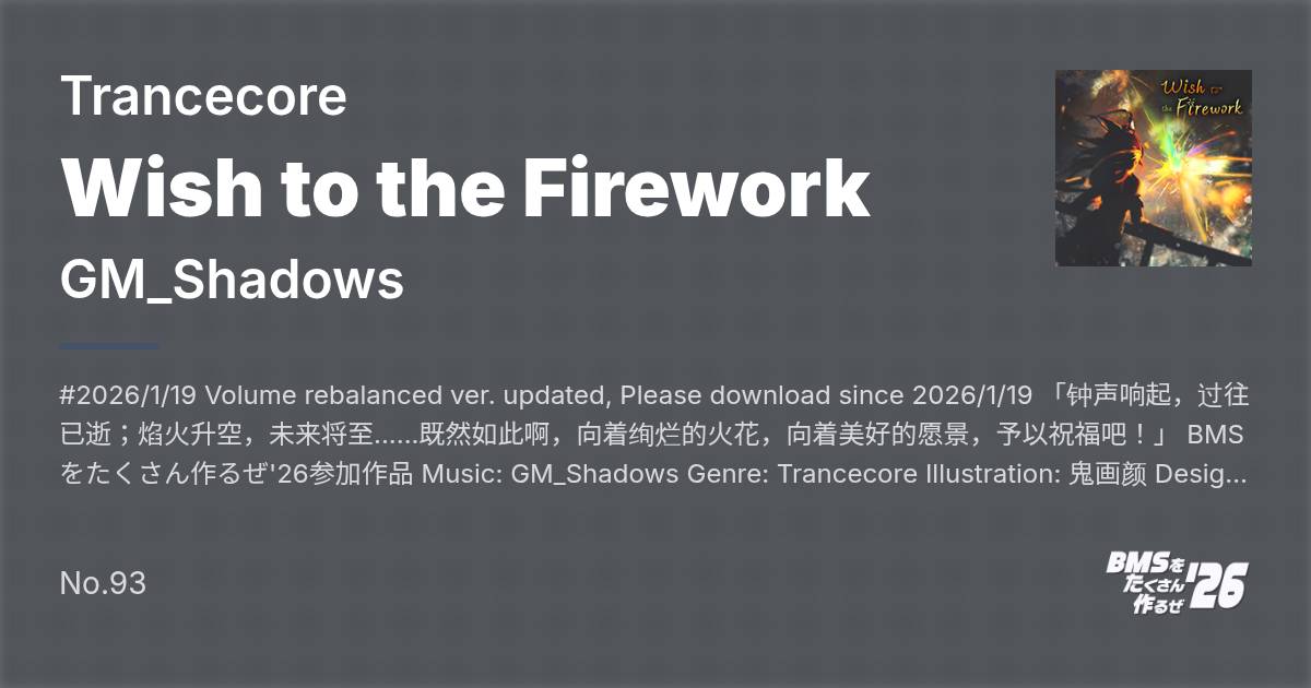 #2026/1/19 Volume rebalanced ver. updated, Please download since 2026/1/19 「钟声响起,过往已逝;焰火升空,未来将至......既然如此啊,向着绚烂的火花,向着美好的愿景,予以祝福吧!」 BMSをたくさん作るぜ'26参加作品 Music: GM_Shadows Genre: Trancecore Illustration: 鬼画颜 Design: GM_Shadows Special Thanks: 狸木萧 BMS: GM_Shadows ☆3 [SP Beginner] by GM_Shadows ☆6 [SP Normal] by GM_Shadows ☆9 [SP Hyper] by GM_Shadows ☆11 [SP Hyper Legacy] by GM_Shadows ☆12 [SP Another] by MiyakoMeow ★12 [はなび] by TangenT Enjoy~