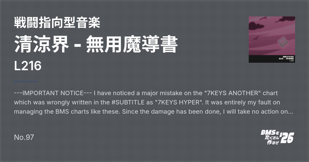 ---IMPORTANT NOTICE--- I have noticed a major mistake on the "7KEYS ANOTHER" chart which was wrongly written in the #SUBTITLE as "7KEYS HYPER". It was entirely my fault on managing the BMS charts like these. Since the damage has been done, I will take no action on updating the BMS archive. I am deeply sorry for the inconvenience. ------- 「7KEYS ANOTHER」において、#SUBTITLE欄に誤って「7KEYS HYPER」と記載されていた重大な誤りを確認しました。このようなBMS譜面の管理における不手際は、全て私の責任です。既に生じた損害については、BMSアーカイブの更新を行わない方針とします。ご迷惑をおかけし、深くお詫び申し上げます。 Genre: Battle-Oriented Music Title: The Refreshing World - Wasted Grimoire BPM: 252 Duration: 2:13