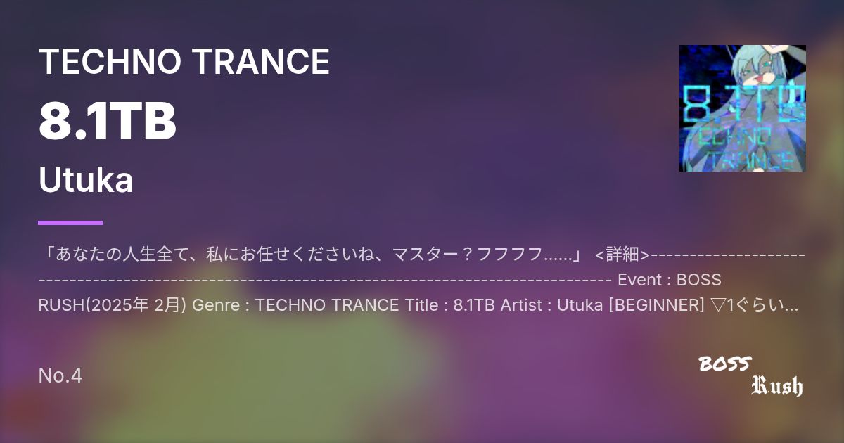 「あなたの人生全て、私にお任せくださいね、マスター?フフフフ……」 <詳細>---------------------------------------------------------------------------------------------- Event : BOSS RUSH(2025年 2月) Genre : TECHNO TRANCE Title : 8.1TB Artist : Utuka [BEGINNER] ▽1ぐらい [NORMAL] ▽7ぐらい [HYPER] ▽9ぐらい [ANOTHER] sl1ぐらい [深層Web10000メートル] ▼22ぐらい? <曲の話>-------------------------------------------------------------------------------------------- 当たり前のようにテクノトランスってジャンルにしたけど……もしかして実在しない? 調べてもテクノかトランスしか出てこない。 中速ボス曲、ノベルゲーとかで淡々と追い詰めていくような、真綿で首を絞めてくるようなシーンのイメージ、 ノベルゲー殆どやった事無いけど。 最初は原義に近いテクノ作ろうとしたけど気が付いたらトランスチックになってた、 残ってるテクノ要素裏で鳴ってるむにょむにょしたアルベジオぐらいしか無い気がする。 せっかくMIDIキーボードを買ったので初導入したのがコレ、アルベジオ全部弾いてくれた。 常に4つ押しが出来る位の譜面にしたかったのでブレイク部分の音の構成に地味に悩んだ。 <譜面の話>------------------------------------------------------------------------------------------ [全体] コンボの下二桁が81に統一されている理由? ……なんででしょうね? 上の方の難易度はトータルの下二桁も81だったりする。 前述のとおりガチ押し譜面しかない、と思ったけど思ったより乱打がある、皿は捨てて来た。 [BEGINNER] 全部単押し(ガチ押し譜面とは一体) マジモンの難易度1を目指したけど簡単すぎて逆に査定不能 何故か皿の枚数が全難易度で一番多い。 流石に81ノーツは無理だった。 [NORMAL] なんかイントロから三つ押し降って来たんですけど……? 4分の同時押しがメイン、基本3か2で降ってくるけどかなり猶予あるから流石に押せると思う。 後半に行くにつれて乱打が増えてくる、異色、隣接、横に広いのを網羅。 地味に上の難易度だと配置してない謎のグロウルベースを演奏できる難易度だったりする。 181%とトータルも高めなのでスコアはともかくクリア自体は楽になってると思う。 [HYPER] 四つ押しが普通に降ってくるがその分密度が低め(4-3-4-3が4-0-4-0になってるイメージ) なるべく8分以上の速度で同時押しが降ってこないようにはした(降ってくる箇所は3-2とかに減らしてる) NORMALの強化と言うよりはANOTHERのマイルド版な味付け、概ね配置を合わせてあるが横の密度が減ってる。 横減らし過ぎた結果ただの乱打譜面になってる気がしないでもない。 こちらもトータル281%と普通(ちょっと高いぐらいかも?) [ANOTHER] ウーデオシ幼稚園、一番最初に作った。 割と明確に腕押しの練習用な譜面、練習向けに尖らせすぎて皿が一枚しかない。 the lost dedicated(BPM134)より気持ち遅い(BPM130)この4BPMの差で大分簡単になったと思う。 シンプルな4つ打ち4-3同時押し、乱打交じりの4等そこそこ多彩にしてみた。 概ね同時系の配置は左右の交互に配置が降ってくるようにしたけど乱打の配置によっては無視してる。 sl1ぐらいにしようと思ったので派手な発狂は無しで淡々としている。 音通りに置くと階段塗れになるので結構音階を無視して乱打にしたりしてる、打鍵感重視。 リズムキープしやすいように一定のリズムで鳴ってるキックを BGMに優先的に回しメトロノームの役割を持たせています。 最後の方の高密度地帯は乱打系の4-1-2-1の瞬間的に重めのセットと2-1-2-1の軽めのセットが交互に(73小節の後半だけ4-1-3-1) この手の発狂慣れてない人想定の息継ぎが出来るような配置にした。 誤魔化しがきき辛いようトータルは281%と低め。 [深層Web10000メートル] ANOHTERベースの強化版、16分ガチ押しラッシュで凄い早い、 ★23サンバランドとほぼ同速なので冷静に考えると物凄く難しい(28Note.secぐらい) 皿が無い分楽になってるとは思うけど私の腕前だと判断できないので何とも。 基本4-2-3-2の構成、なるべく無いようにしたけど微縦は2までになってる、 なんか全体的に右手側に螺旋配置が置くなった気がする、そうでもないかも。 多少薄くなったりはするけど一生同時押しが降ってくるので気合で頑張ってください(は?) トータルは681%(1Noteで0.205%) <BGAの話>------------------------------------------------------------------------------------------- 横にデカい譜面を作る予定だったのでキャラも横にデカくした。 実はこのBMS作るうえで一番時間かかったのがキャラデザ、なんかサイバー感が出なくて難儀した。 全体的に素材サイトのをそのまま拝借、ちょっと色変えたりなんやかんやした程度、上にキャラ乗っけたぐらい。 動く方の立ち絵で鼻描いてみたけど普通に無い方が可愛い気がする。 地味に寝そべってる方の立ち絵は2025年で一番初めに描いた絵だったりする、書初めに性欲が出過ぎている。 登場キャラのプロフィールはざっくりと未来のメジャーな量産型お手伝いロボットみたいな感じ、家事とかしてくれるルンバLv8.1億。 クラウドに効率的なお世話方法のビ