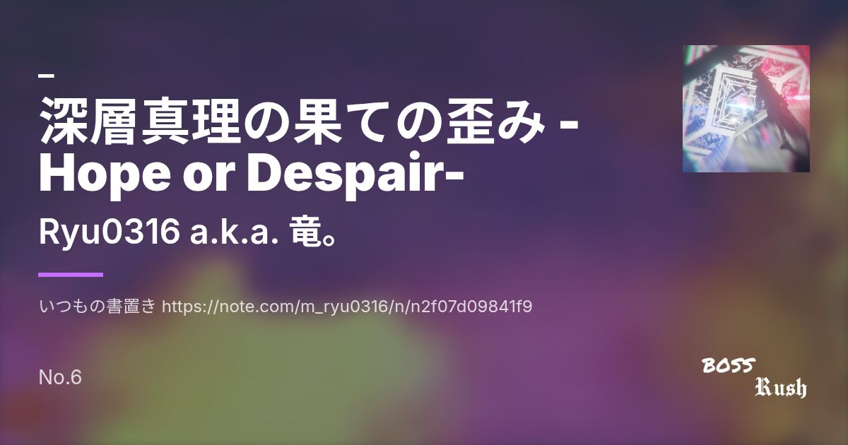 いつもの書置き https://note.com/m_ryu0316/n/n2f07d09841f9 _____________________________________________________ 真実の果てで見つけた歪み、それは希望か、絶望か。 _____________________________________________________ ボス曲ってなんだ... 数億年ぶりに本名義でインストBMSを出したらしいです。 __________________________________________________________________________________________________________________________ !!!(Deprecated)と書いているInsane(黒譜面)はやりたい放題置いているおまけ譜面なので初回はAnother以下の譜面でお願いします!!! __________________________________________________________________________________________________________________________