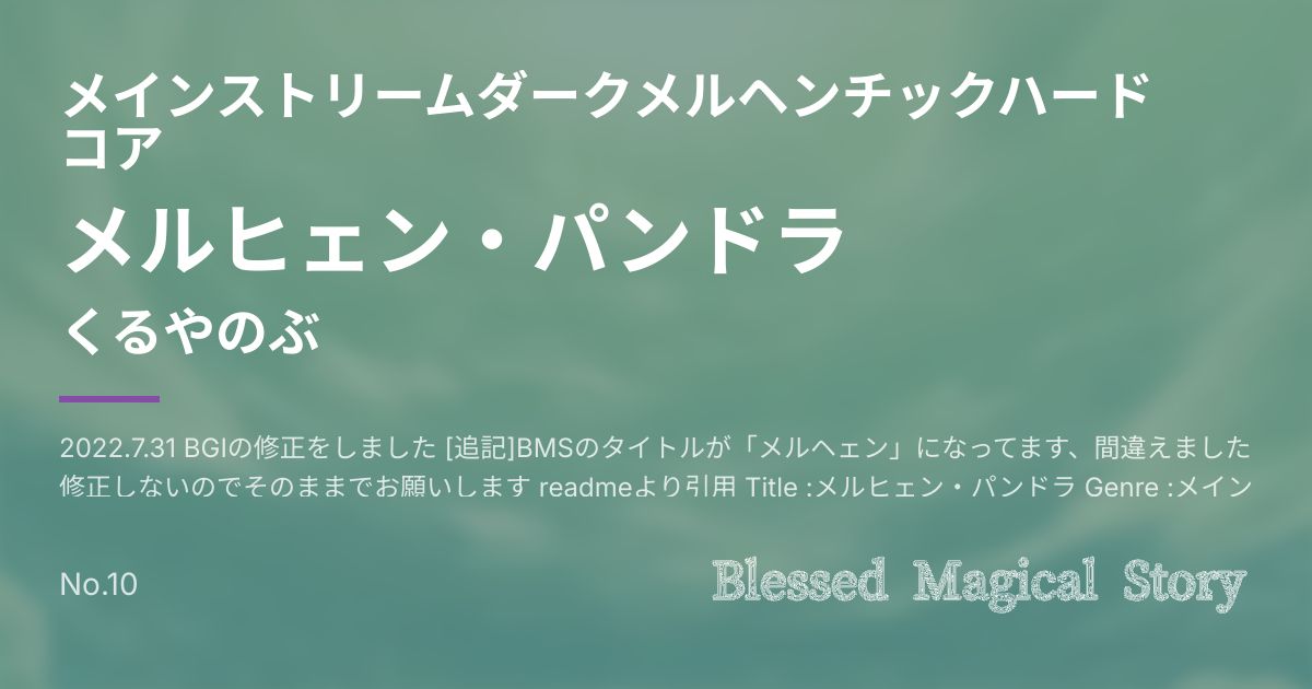 2022.7.31 BGIの修正をしました [追記]BMSのタイトルが「メルヘェン」になってます、間違えました修正しないのでそのままでお願いします readmeより引用 Title :メルヒェン・パンドラ Genre :メインストリームダークメルヘンチックハードコア BPM :220 Artist :くるやのぶ BGI :くるやのぶ Playlevel SP NORMAL :6 SP HYPER :10 SP ANOTHER :12 SP INSANE :13(★10程度?) SP 1000年 :14(むずかしいね) --------------------------------------------- [くるやのぶ] 魔法の国の、それはそれはメルヘンチックな国の城の 深く奥に封印された開けると全てが闇に包まれてしまうという禁忌のパンドラの箱 怪しい鍵を握りしめその場所へ向かう一人の魔法使い、そして・・・ みたいなのを想像しました、曲を聴いてもられば伝わると思いますが 開いてます、開いた後は激しくてもうめちゃくちゃな世界をイメージしました、おもにガバキックで ダークメルヘンな雰囲気好きなんですよね~~~~ BGIも頑張った~~~~~~~! メルヘンチックですが曲名は""メルヒェン""・パンドラですよろしくお願いします! 2022.7.30 ----------------------------------------------------------------------------------------- [くるやのぶ] twitter ID :@kl8nb https://twitter.com/Kl8nb ※このBMSファイルはLR2、beatorajaで動作確認しています。