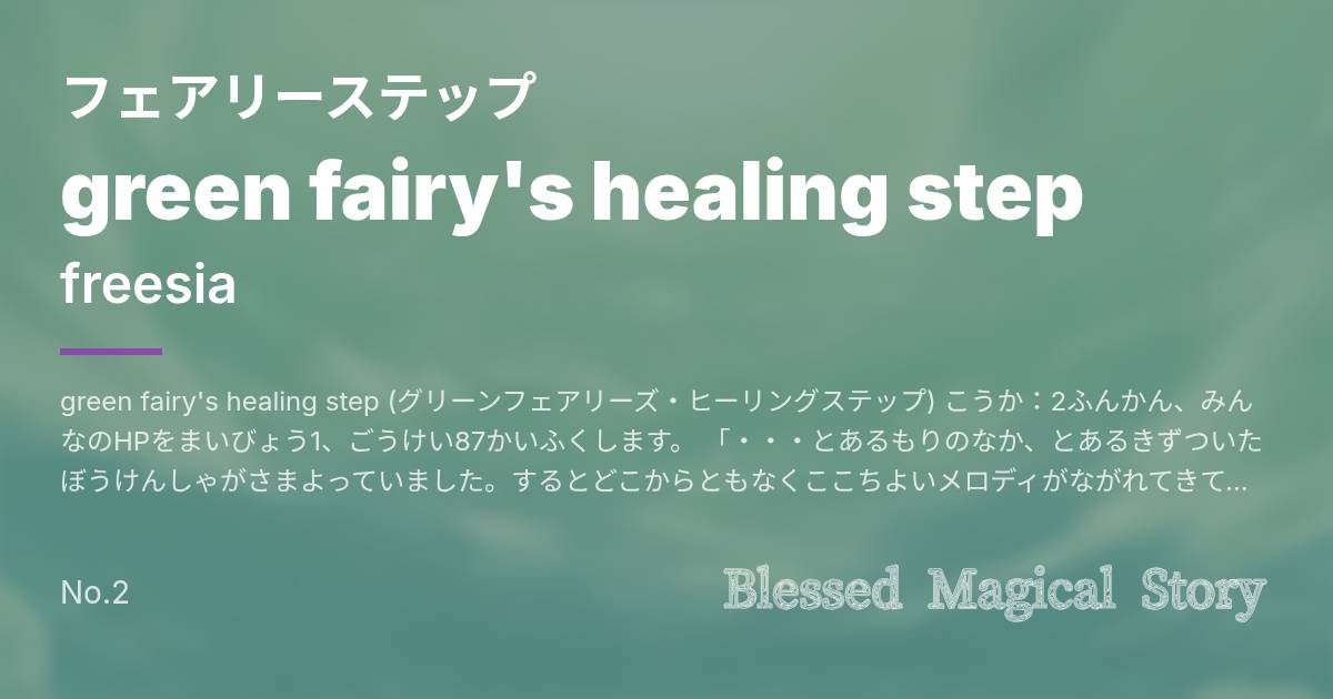 green fairy's healing step (グリーンフェアリーズ・ヒーリングステップ) こうか:2ふんかん、みんなのHPをまいびょう1、ごうけい87かいふくします。 「・・・とあるもりのなか、とあるきずついたぼうけんしゃがさまよっていました。するとどこからともなくここちよいメロディがながれてきて、みるみるうちにきずがふさがっていくではありませんか。」 blue fairy's lullaby step (ブルーフェアリーズ・ララバイステップ) こうか:2ふんかん、みんなをねむりにおとします。 「あたりはもうまっくら、ぼうけんしゃはあんしんしたのか、すぐねむりにおちてしまいました。」 yellow fairy's cheerful step (イエローフェアリーズ・チアフルステップ) こうか:2ふんかん、みんなのぜんステータスを471アップします。 「めをさますと、そこはふしぎなようせいたちのすむむらでした。どうやらようせいたちのうたげにしょうたいされたようです。ぜんしんにちからがみなぎってきます。」 red fairy's blazing step (レッドフェアリーズ・ブレイジングステップ) こうか:2ふんかん、みんなのこうげきりょくを1000アップします。 「うたげはしゅうばんにさしかかり、あたりはゆうやけ、たいまつにひがともりました。からだがぽかぽかとあたたまっていくのをかんじます。」 purple fairy's confusion step (パープルフェアリーズ・コンフュージョンステップ) こうか:2ふんかん、みんなをこんらんじょうたいにします。 「うたげがおわると、とつぜんめまいをおぼえたぼうけんしゃはたおれてしまいました。きがつくとそこはもといたもりのなかです。ゆめでもみていたのかとふしぎにおもいました。ぼうけんしゃのたびはこれからもつづきます。・・・」 全難易度で曲変更があります。五つの色のイメージからそれぞれの妖精の性格を表現してみました。 色の意味についてはBMSをやってる方ならもうおわかりだと思います。 ちなみに困ったらグリーンかブルーをおすすめします。(高難度作るの難しい)