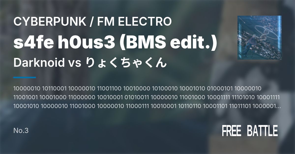 10000010 10110001 10000010 11001100 10010000 10100010 10001010 01000101 10000010 11001001 10001000 11000000 10010001 01010011 10000010 11001000 10001111 11101010 10001111 10001010 10000010 11001000 10000010 11000111 10010001 10110110 10001101 11011101 10000010 10110101 10000010 11001000 10000010 10100010 10000001 01000010 訳)この世界に安全な場所など存在しない。 (Darknoid(訳:TaW)) りょくちゃくんです。 この度TaWさんと合作させていだきました。 自分がざっくりと編曲側に回る合作は経験がありましたが、 自分が作曲担当に重きを置いた合作は初めてでした。 最終的にTaWさんがすごく良い感じにまとめてくださり、 それを最初聴いた時はとても感動しました。 余談ですが、4曲のEPのうち1曲を合作したいと提案された時から、 EPの概要が公に告知されるまでは、 4曲それぞれTaWさんと別の人1人ずつが合作してるものだと思ってたので、 合作者もといゲストコンポーザーが私だけと知った時は軽くビビりました。 コンセプトとして、ディストピア社会が舞台、自分の家を出て敵のアジトまで走り出す、 という感じで、Darknoid氏のBMSのBGAにあるようなきらびやかでありつつも ダークなディストピアな世界らしさを出せるよう頑張りました。 長くなってしまいましたが、上記のようなコンセプトがうまく表現され とてもよい曲に仕上がったと思います。 楽しんでいただければ幸いです! 君が未来都市アルカディアで見たものは何か? よろしくお願いします。 (りょくちゃくん)