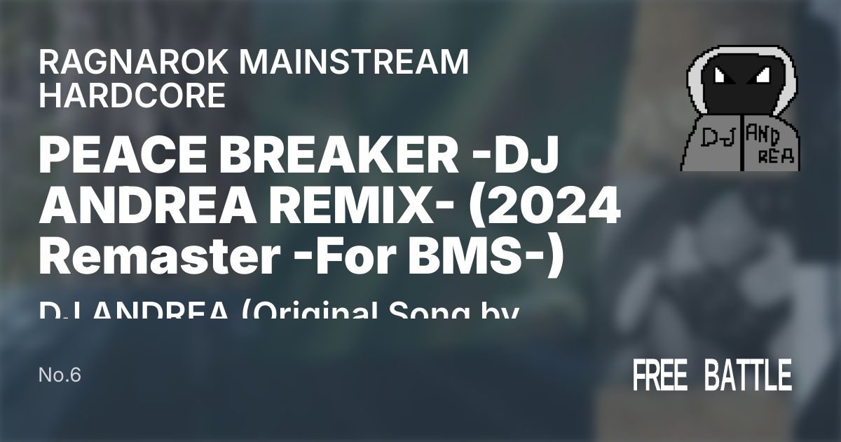 (2024年6月8日追記)この楽曲における音量が原曲と同じく大きすぎるという指摘を頂いていたので、早速全キー音のデシベルを12db分減らしたという修正を急遽やってきました。 これなら原曲とは同等の音量になっているはずです。 これに伴い、DLリンクを一新しました。 これだけで失格を食らうと思うけど、皆さんに迷惑をかけてしまって申し訳ないです。(´・ω・`) (2024/6/8 Update)I appologize about the loud key sounds, so I readjusted the key sound's volume to -12db. This should be the same volume level as the original PEACE BREAKER. So I updated the BMS ZIP file's download link. Alhtough I might get disqualified for this mistake, I'm really sorry to mess up on the mastering. (´・ω・`) この楽曲におけるロング版:https://youtu.be/2s2LPpchplA (以下は俺の実話ベースのエピソードなので、皆さんも是非読んで下さい) 2014年、俺は当時KONAMIのBEMANI系音ゲーにおける代表作であるbeatmania IIDXにハマっていた。 そんなある日、俺が彷徨ってたYouTubeにてとある動画を発見し、それが後にて俺の音ゲーにおける世界観に革命を起こしてくれた「PEACE BREAKER」のBREAKER差分におけるAutoPlay動画でした。 しかし当時は譜面のノート数にこだわっていた事と、BMSにおける大人の事情は知らなかったので、俺はてっきり「BMSにはこう言う黒MENDESを凌ぐ譜面があるとは( ゚д゚)」と大勘違いしながらびっくりした。 もちろんこの後俺はBMSをいっぱい遊んでようやく「そもそもBMSはbeatmaniaシリーズのクローン版」である事と、BMSのおかげで最近IIDX EPOLISにてBMSのPUPA等でお馴染みのモリモリあつしさんが「ACTØ」というオリジナル楽曲を提供できた程、実は最近稼働開始したばかりのポラリスコード(上記のPUPAも入っています)も含めたKONAMI製音ゲーとかにて参加できるチャンスを与える修行場でもある、という事実に気づいて考え方を改めたけど、その時は俺が無知で申し訳なかったです。 更に気がつけばその激動の出会いにおける瞬間から10年が経ち、当時アスペルガー症候群による悩みと葛藤と戦っていた高校生の俺は現在八丈島を拠点としてコンポーザー活動をする高卒系社会人及び全部独学で学んだハーフ系BMSコンポーザーになるとは思っていなかったです。(´・ω・`) おまけに俺が当初クオリティ的にダサいリミックス楽曲を色々と作っていた時は元々「どうやってまともでダサくない楽曲を作るか」とかのノウハウにおいて欠かせない土台を根本的に作る為に「経験を積むよりまずは実際に作ってみないと何も始まらない」とかの理由で、俺は「作曲を実際やる事による経験を何度も重ねて立派な1人前コンポーザーになる」という主流で俺はここまで成長しました。 本題に入るけど、今回はFREE BATTLEの運営曰く「BMS楽曲のコピー作品、又はアレンジBMSとリミックスBMSを登録してもOK」と言ってたので、この「BMSとの出会いで作った10年間における俺の集大成」みたいな感じで俺は「PEACE BREAKERの偉大さと至高さをリスペクトした、俺のBMSとの出会いにおける原点にして頂点として相応しい、まさに俺の最強にして最高のリミックス」のつもりで作りました。 ジャンルが「RAGNAROK MAINSTREAM HARDCORE」であるのは、そもそも原曲のBGA担当である1Bさんによる、原曲のBGA音源動画での説明欄曰く彼は「破壊神が舞い降り、汚れた大地に審判を降す。」と言ってたので、俺も「破壊神による審判を下す為、真ラスボスと対決する幕が開く」というスローガンを意識した、いわゆる実際のRAGNAROKらしい真ラスボス戦BGMっぽい、まさに壮大かつ激ムズクラスの発狂差分にも対応できるメインストリームハードコアを作りました。 もちろんメインストリームハードコアの「メインストリーム」らしさを出す為に、「俺の"""主流"""で考えるメインストリームハードコア」と「今のハードコア界隈で"""流行"""しているベース系ハードコアやブレイクコア等の色んな要素を取り入れたメインストリームハードコア」と「IIDXでよく見かける、"""メロディアスでガバ寄りの硬いキックがウリ"""のメインストリームハードコア」による、ダブルミーニングならぬトリプルミーニングみたいなつもりでメインストリームハードコアらしいメインストリームハードコアを作りました。 ちなみに原曲のサンプルを一部使っているのは、原曲らしさを出す為に欠かせないリスペクト要素のつもりです。 また、BPMが190であるのは「音ゲー向けメインストリームハードコアと言ったら190が代表的じゃん?」という理由でメインストリームハードコアが大好物の俺による変な見解である説があるかもしれないけど、何よりも「beatmaniaシリーズにおけるハードコア楽曲のパイオニア役ことL.E.D.さんのHELL SCAPER(ジャンルはハードコアの一つであるガバだけど表記がGABBAHの楽曲)の開始BPMが190」である事もあり、しかもHELL SCAPERも今年で誕生25周年であるという事とそれらを全てリスペクトする為に、このリミックスのBPMを190に設定しました。 ちなみに今回のこの楽曲における1番大変だった部分はマス