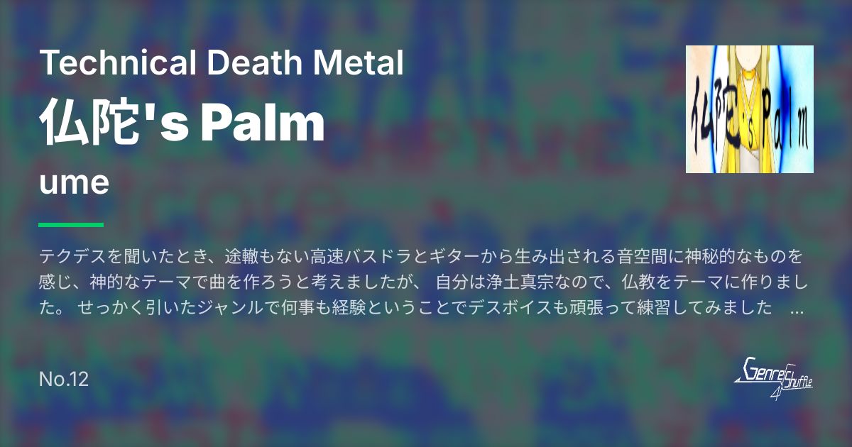 テクデスを聞いたとき、途轍もない高速バスドラとギターから生み出される音空間に神秘的なものを感じ、神的なテーマで曲を作ろうと考えましたが、 自分は浄土真宗なので、仏教をテーマに作りました。 せっかく引いたジャンルで何事も経験ということでデスボイスも頑張って練習してみました おじさんになんて無茶をさせるんだこのイベント テクデスは音ゲーと相性がいいという噂を確かめるため 自分としてはほぼ初めて、高難易度ボス曲を意識して作りました。 是非高難易度譜面プレイの果てに解脱し無為涅槃の境地に至っていただきたいと思います。 そんな感じでよろしくお願いいたします!