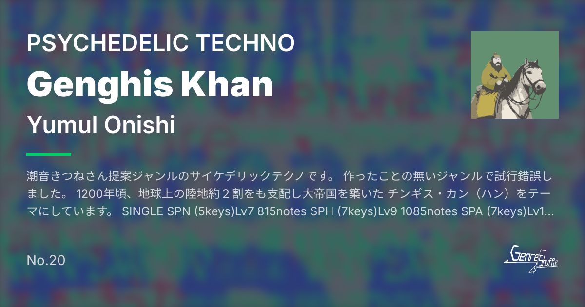潮音きつねさん提案ジャンルのサイケデリックテクノです。 作ったことの無いジャンルで試行錯誤しました。 1200年頃、地球上の陸地約2割をも支配し大帝国を築いた チンギス・カン(ハン)をテーマにしています。 SINGLE SPN (5keys)Lv7 815notes SPH (7keys)Lv9 1085notes SPA (7keys)Lv11 1215notes DOUBLE DPN (10keys)Lv8 901notes DPH (14keys)Lv9 1045notes DPA (14keys)LV10 1136notes