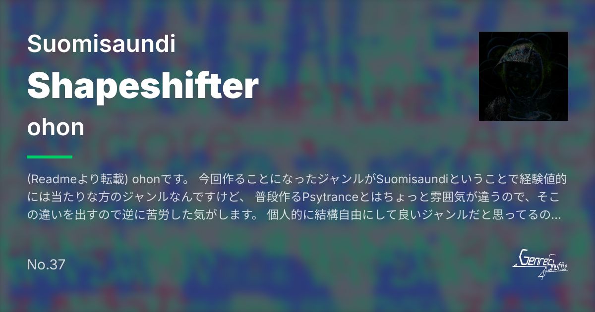 (Readmeより転載) ohonです。 今回作ることになったジャンルがSuomisaundiということで経験値的には当たりな方のジャンルなんですけど、 普段作るPsytranceとはちょっと雰囲気が違うので、そこの違いを出すので逆に苦労した気がします。 個人的に結構自由にして良いジャンルだと思ってるので割とフリーダム目に作ったつもりです。 楽しんでいただけると幸いです。