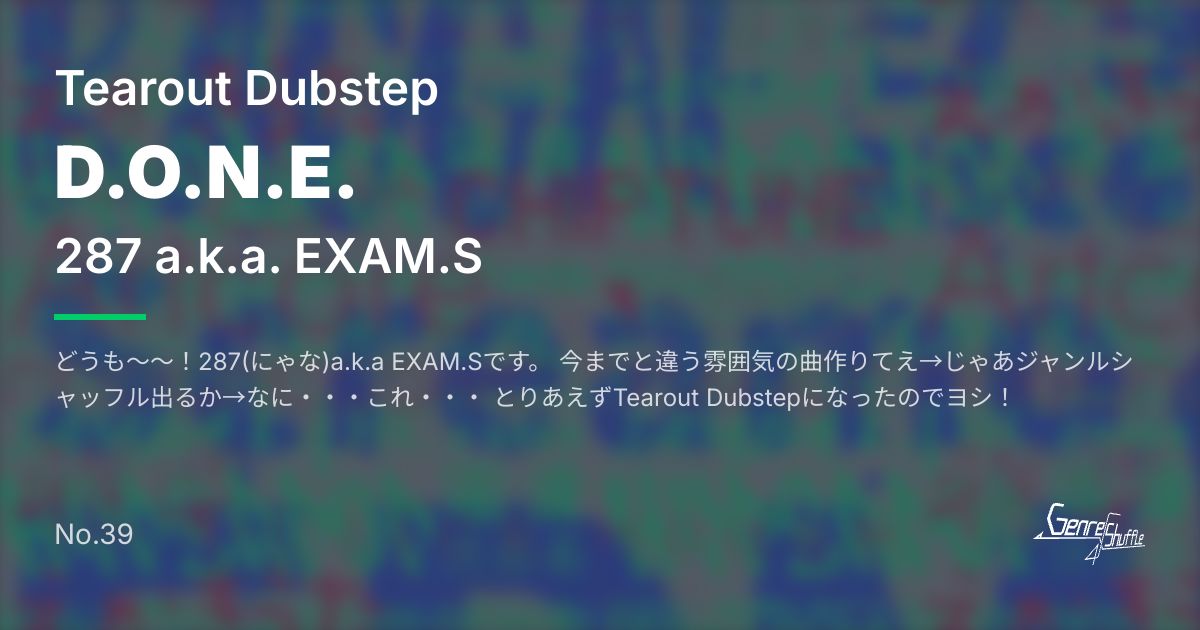 どうも~~!287(にゃな)a.k.a EXAM.Sです。 今までと違う雰囲気の曲作りてえ→じゃあジャンルシャッフル出るか→なに・・・これ・・・ とりあえずTearout Dubstepになったのでヨシ!