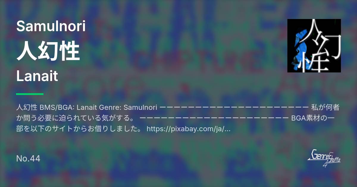 人幻性 BMS/BGA: Lanait Genre: Samulnori ーーーーーーーーーーーーーーーーーーーーー 私が何者か問う必要に迫られている気がする。 ーーーーーーーーーーーーーーーーーーーーー BGA素材の一部を以下のサイトからお借りしました。 https://pixabay.com/ja/ https://www.pixiv.net/users/5196934