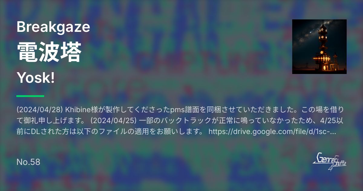 (2024/04/28) Khibine様が製作してくださったpms譜面を同梱させていただきました。この場を借りて御礼申し上げます。 (2024/04/25) 一部のバックトラックが正常に鳴っていなかったため、4/25以前にDLされた方は以下のファイルの適用をお願いします。 https://drive.google.com/file/d/1sc-9RGpcYWlnt1Yvhw7kcla6BNLl4OVb いろいろとこねくり回した結果、ShoegazeでもBreakcoreでもBreakgazeでもないものになってしまいました Breakgazeを心待ちにしていた方、おれは!!!!弱いっ!!!!(ドン!!)