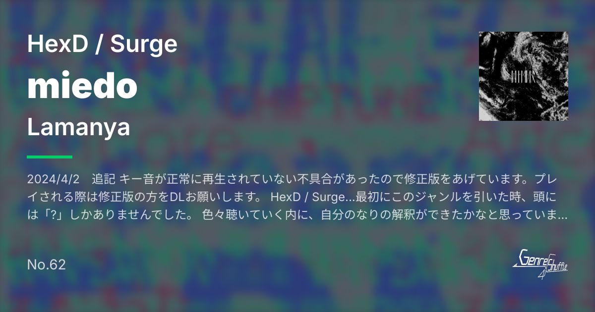 2024/4/2 追記 キー音が正常に再生されていない不具合があったので修正版をあげています。プレイされる際は修正版の方をDLお願いします。 HexD / Surge...最初にこのジャンルを引いた時、頭には「?」しかありませんでした。 色々聴いていく内に、自分のなりの解釈ができたかなと思っています。 ちょっとホラーなテイストですが、hexが悪魔という意味があるみたいなので、よしとします(?)