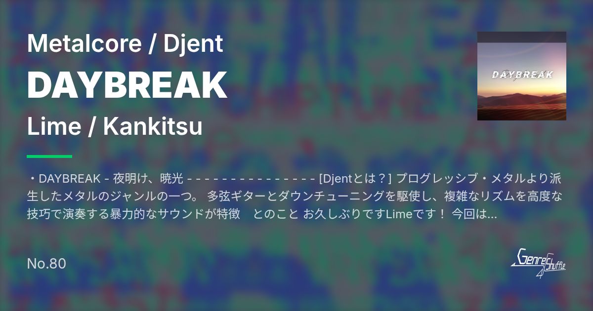 ・DAYBREAK - 夜明け、暁光 - - - - - - - - - - - - - - - [Djentとは?] プログレッシブ・メタルより派生したメタルのジャンルの一つ。 多弦ギターとダウンチューニングを駆使し、複雑なリズムを高度な技巧で演奏する暴力的なサウンドが特徴 とのこと お久しぶりですLimeです! 今回はMetalcore(Djent)という事で、かなり制作難易度の高いジャンルを引いたわけなのですが、 苦心の甲斐があり、自分のメロディアスなスタイルも織り交ぜつつ上手く音楽ゲームという土俵に落とし込めたのではないかと思います。 一度はやってみたかった男性ボーカルのバンドサウンド、エモーショナルな物に仕上がったと思います。楽しんで頂ければ幸いです…! 手前味噌ですが、ANOTHER譜面が会心の出来ですので是非ともプレイしてみて下さい! - - - - - - - - - - - - - - -