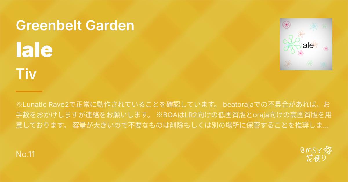 ※Lunatic Rave2で正常に動作されていることを確認しています。 beatorajaでの不具合があれば、お手数をおかけしますが連絡をお願いします。 ※BGAはLR2向けの低画質版とoraja向けの高画質版を用意しております。 容量が大きいので不要なものは削除もしくは別の場所に保管することを推奨します。 --------------------------------------------------- -人々を優しく包む温もりに溢れる庭園- Title:lale Genre:Greenbelt Garden BPM:141 Artist:Tiv【X(Twitter):@tivmusic_chp】 BGA:Tiv --------------------------------------------------- まさかの花便りに2作出すことになりました。まあ色々事情があるのでreadmeに詳しく書きます。 こっちの作品は先に登録した「Rainy Day Morning Glory」とは裏腹に明るい曲です。 特に繋げてる意図はないのですが、雨が上がっていい景色が広がってきた、 みたいな感じに偶然なっちゃいましたね。 Bた作24に出した「CyanPort」同様、本作にもモデルとなっている場所があります。 大阪・鶴見緑地の公園です。 1990年に花博が開催された場所であり、公園では各国の庭園だったり、いろんな花を見たりすることができます。 そんな鶴見緑地の和やかな花畑、風車をモデルに曲を作ってみた。そんな感じです。 地下鉄鶴見緑地駅のデザインのテーマ、大阪市鶴見区の区花、花博のシンボルがチューリップなので、 曲名もそれにちなんで、トルコ語でチューリップという意味の「lale」となっています。 諸事情でBGAにチューリップは出てこないのですが、 あくまでチューリップに限らず鶴見緑地の花畑を題材とした曲、と思っていただければ幸いです…。ごめんなさい…。 この作品で一足先に暖かい春を感じていただければ幸いです。 X(Twitter)(気ままに更新中) https://twitter.com/tivmusic_chp SoundCloud(色々上げたり上げなかったり) https://soundcloud.com/tivremisuke note(たまーにブログ的な何かを。過去のBMSも保管中) https://note.com/tiv_03sk YouTube(BGAや音源などを気まぐれで投稿) https://www.youtube.com/channel/UC3pMoThTt8gpoAHPsNfIi8Q 連絡用メアド(TwitterのDMが出来ない場合の問い合わせやリンク切れ報告に) tivdirectmass@gmail.com